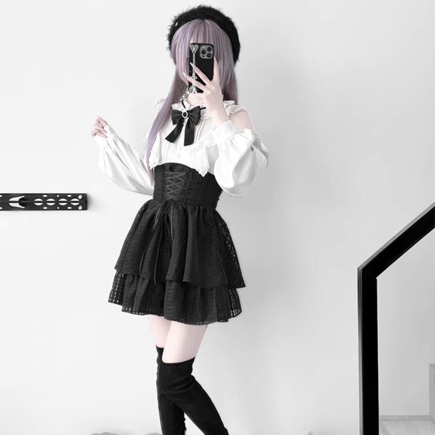 白いブラウスに、編み上げデザインのコルセット風トップス、そしてフリルがたっぷりの黒いスカートがセットになった、地雷系ファッションの甘辛MIXスタイル。可愛らしさとダークな雰囲気が同居する、個性的なコーディネートです。