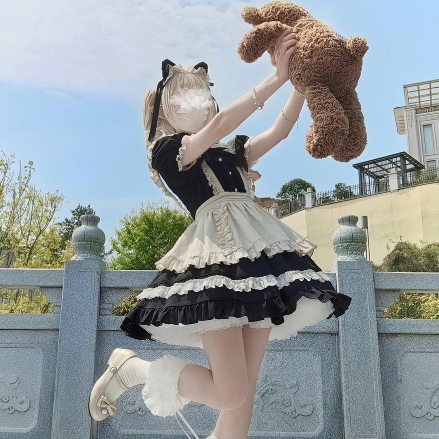 黒のトップスに白い襟とエプロンが純粋さと几帳面さを演出し、多層のスカートがボリューム感たっぷりのシルエットを作り出します。