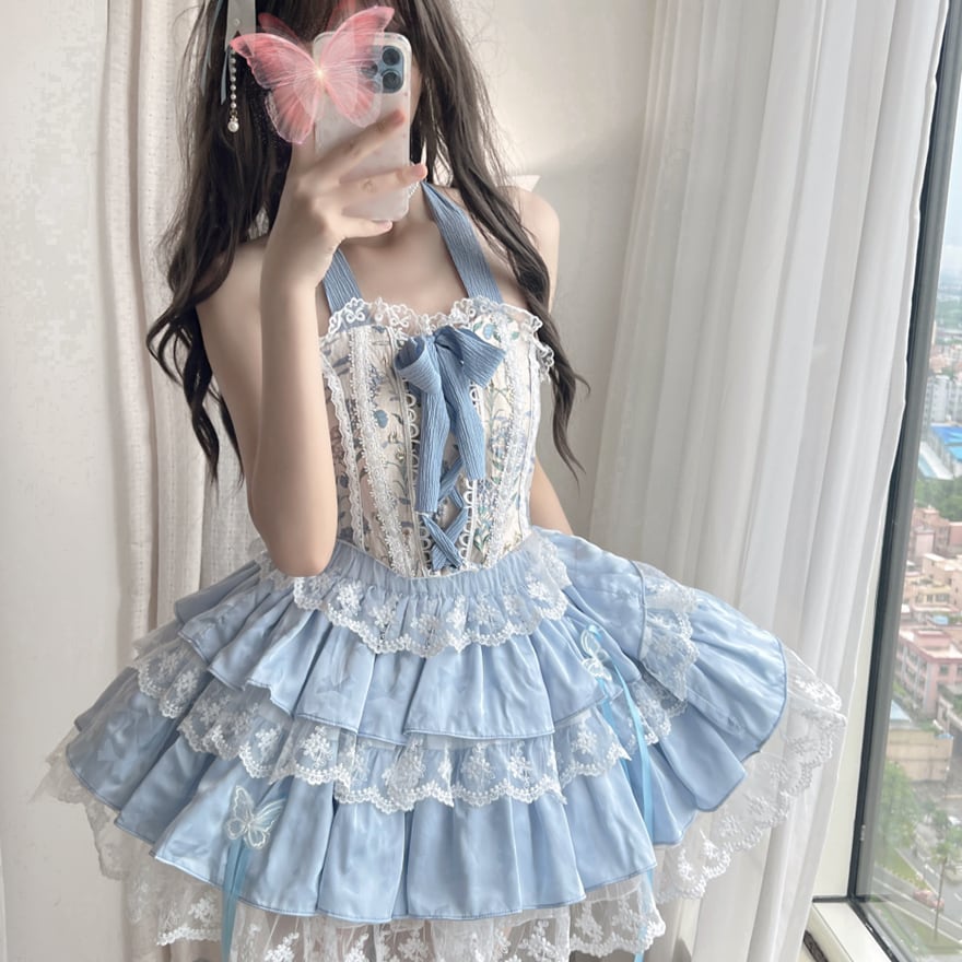 ブラウスとスカートのセットアップで、ブラウスは繊細なレースと胸元の編み上げリボンが特徴的。ホルターネックのデザインがデコルテを美しく見せます。スカートは、たっぷりのフリルとレース、そして蝶のモチーフ(ライトブルーのみ)が施されたティアードスカートで、ふんわりと広がるシルエットが魅力です。リボンやレースアップのデザインが随所に散りばめられ、細部までこだわりが感じられます。