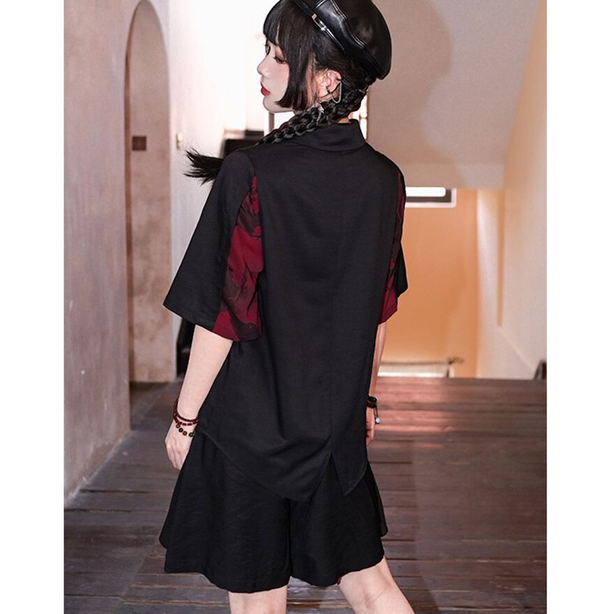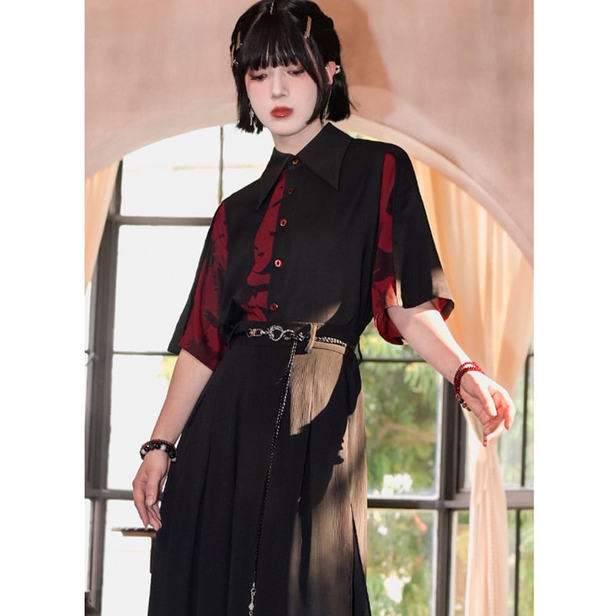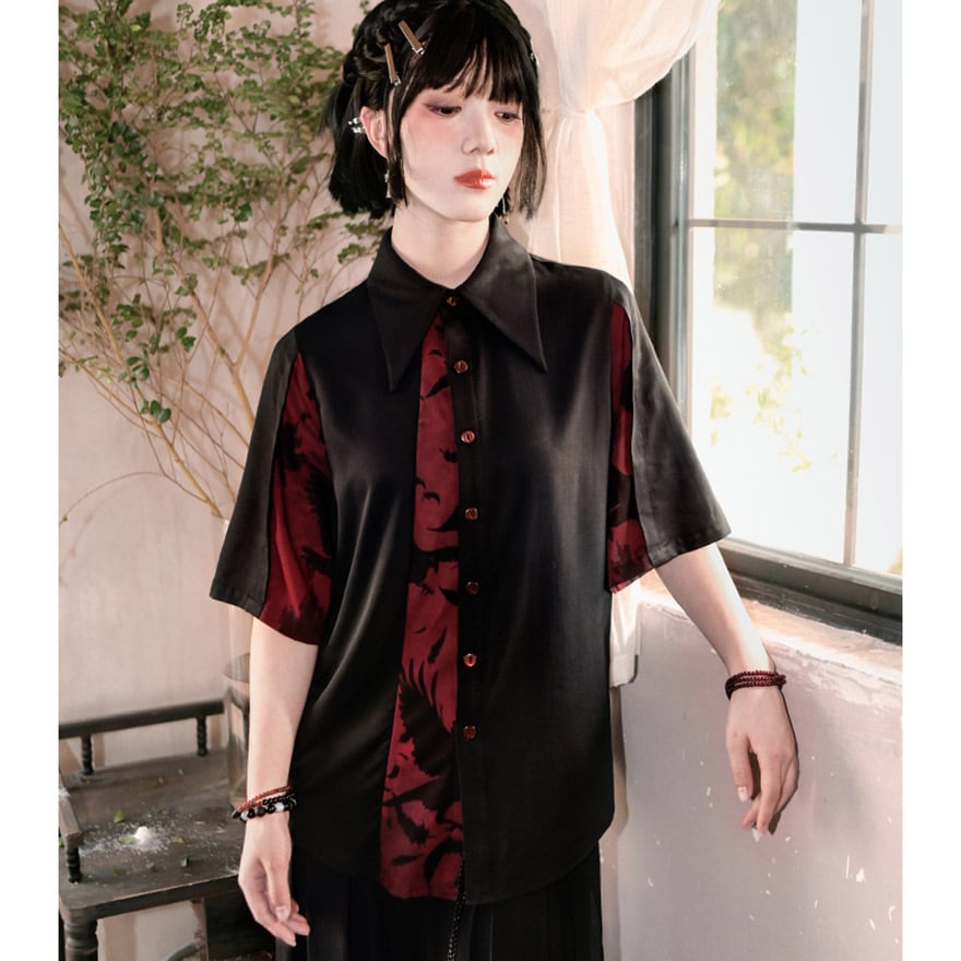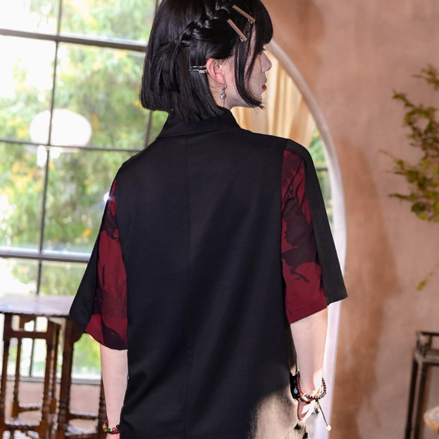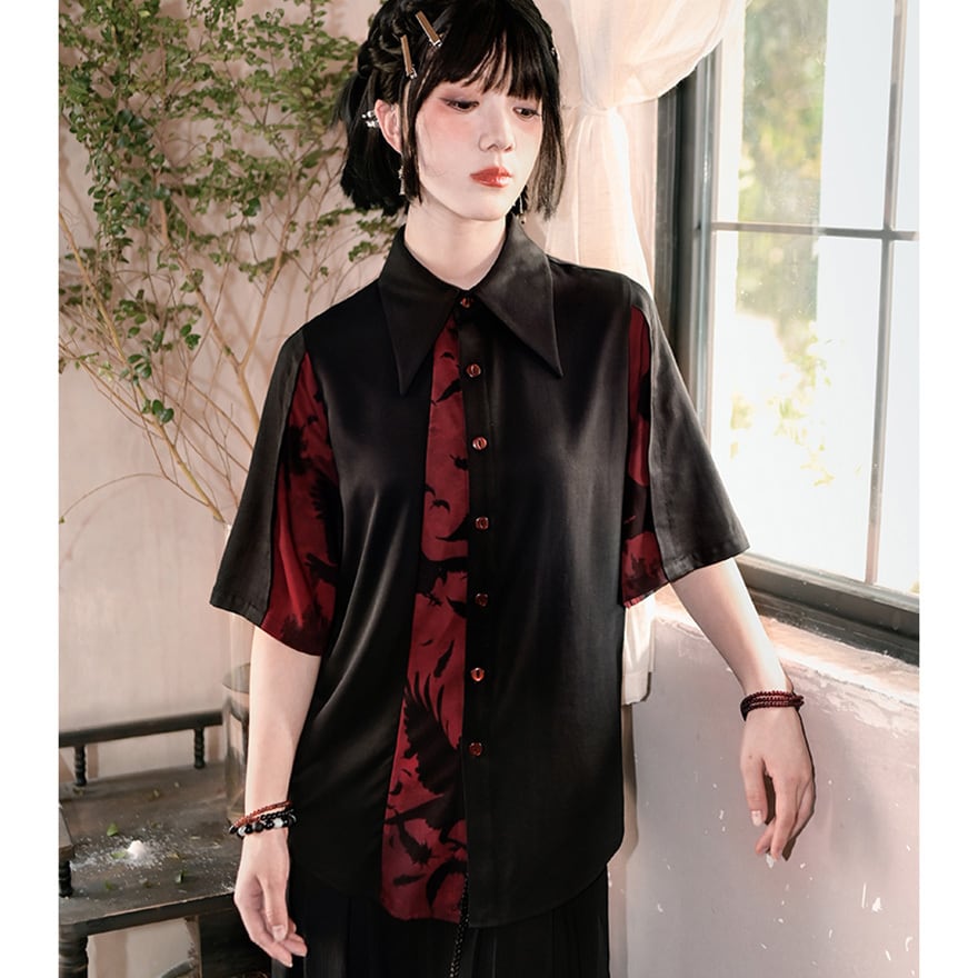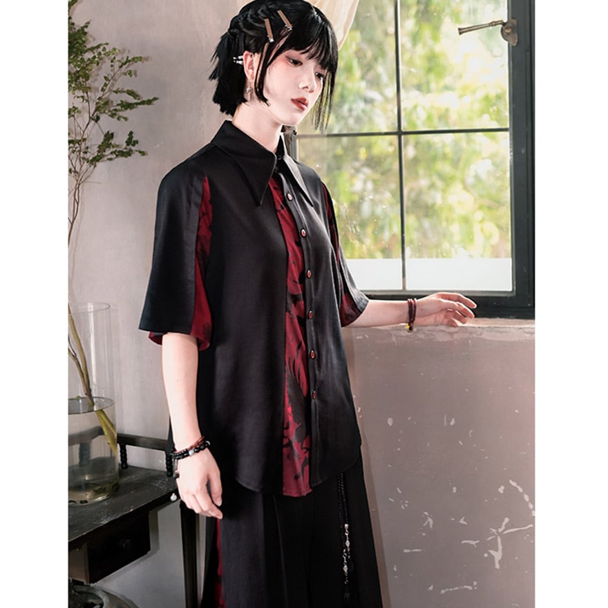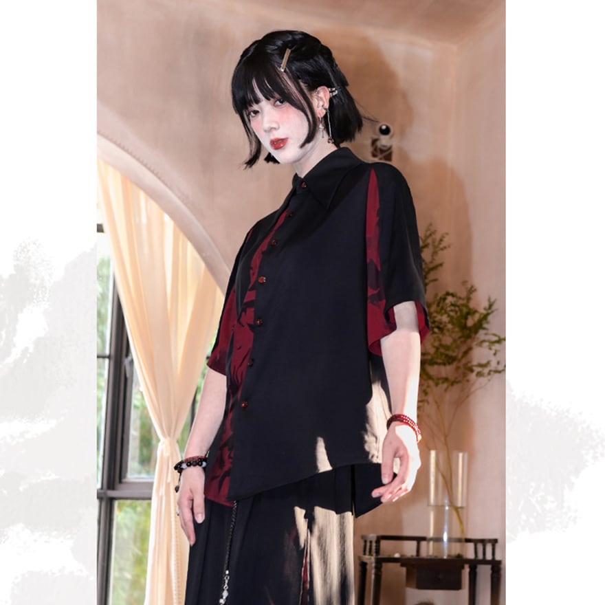 闇夜を切り裂くような、ブラックと深紅のコントラストが目を惹くチャイナ風半袖シャツ。