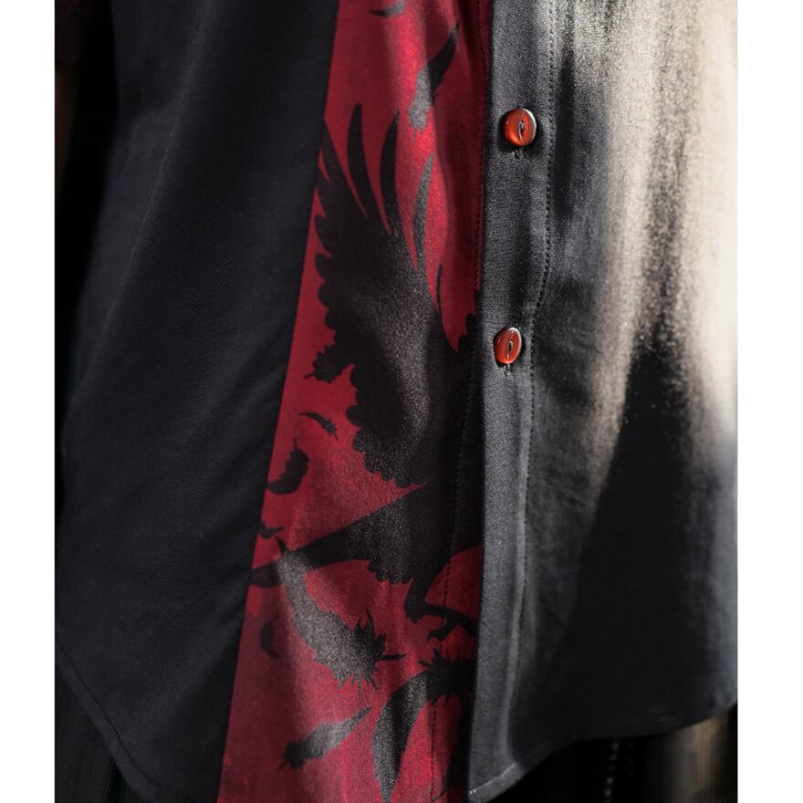 滑らかな肌触りの生地に鮮烈なレッドの切り替えとそこに潜む鴉のプリントが、禁断の絵画のような妖しい美しさを演出。