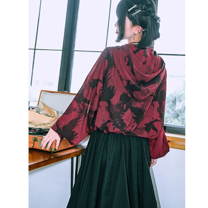闇に溶け込む鴉たちが舞う、孤高の雰囲気を纏う薄手ジャケット。古怪舎ならではの退廃的な世界観を、繊細な総柄プリントで表現しました。