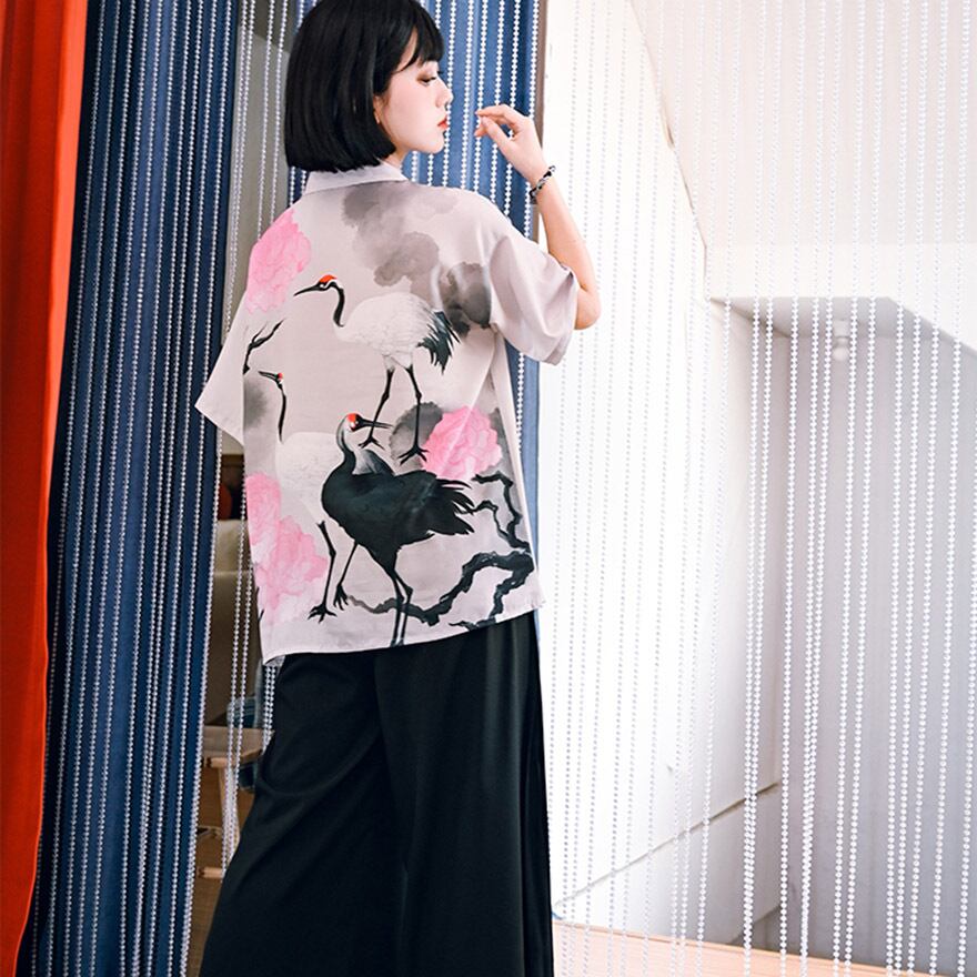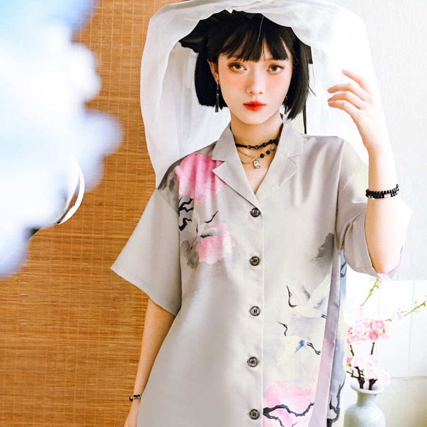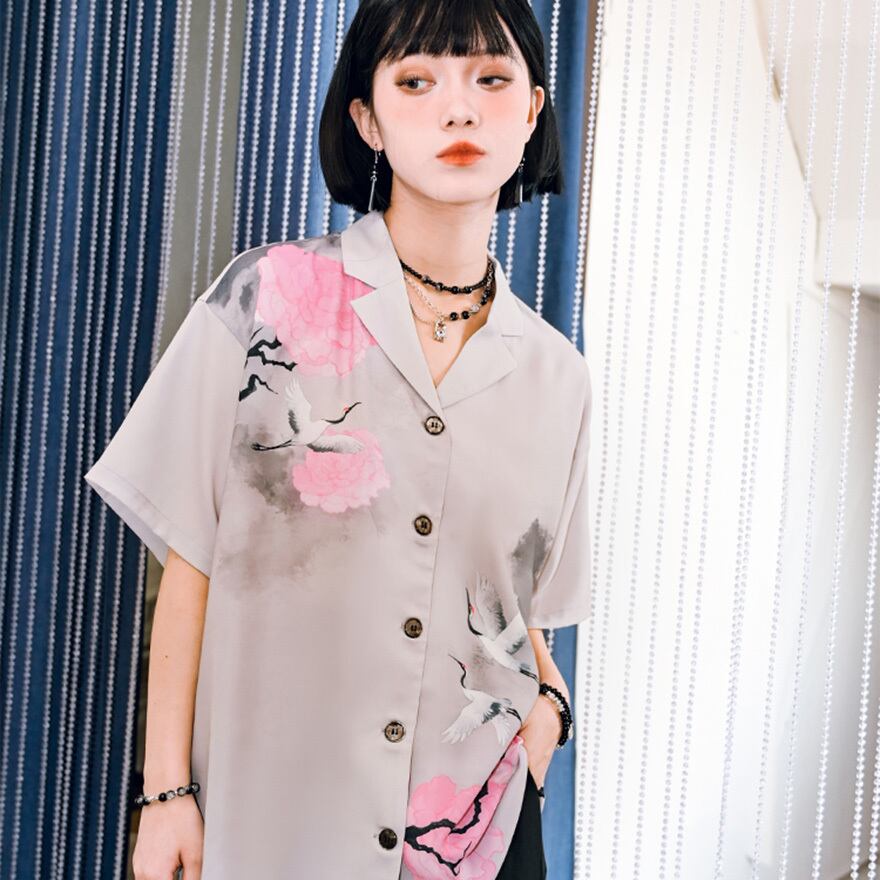 チャイナ風 中華服 古怪舎 半袖シャツ 鶴 プリント 中華系ファッション 30代コーデ