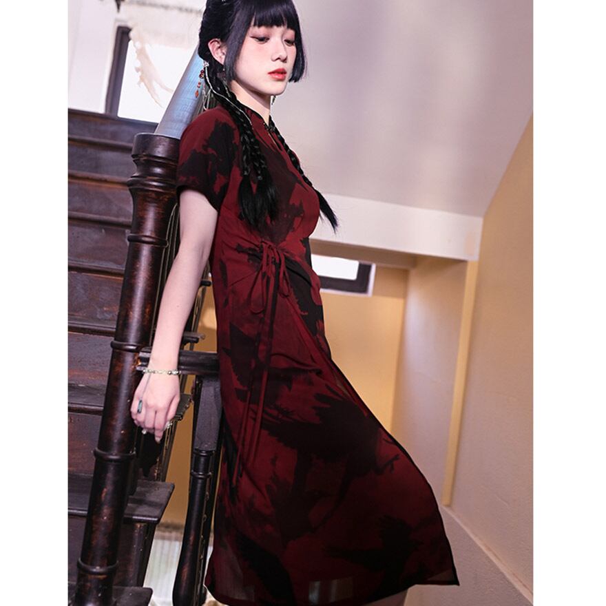深紅のキャンバスに、漆黒の鴉たちが乱舞する。古怪舎が贈るのは、妖しくも美しいチャイナ風ワンピースです。
