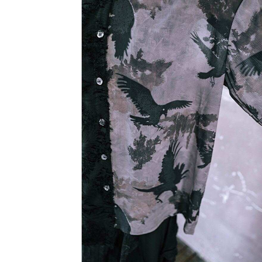 漆黒の闇を表現したかのようなダメージ加工風の生地と、水墨画タッチで描かれた鴉たちが乱舞するグレー系の生地が大胆に切り替えられたデザイン。