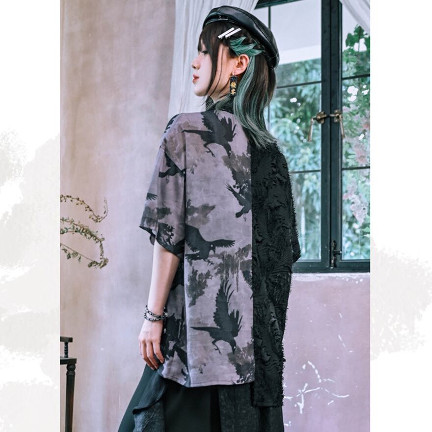 チャイナ風 中華服 古怪舎 半袖 シャツ バイカラー 鴉 プリント柄 中華系ファッション 30代コーデ