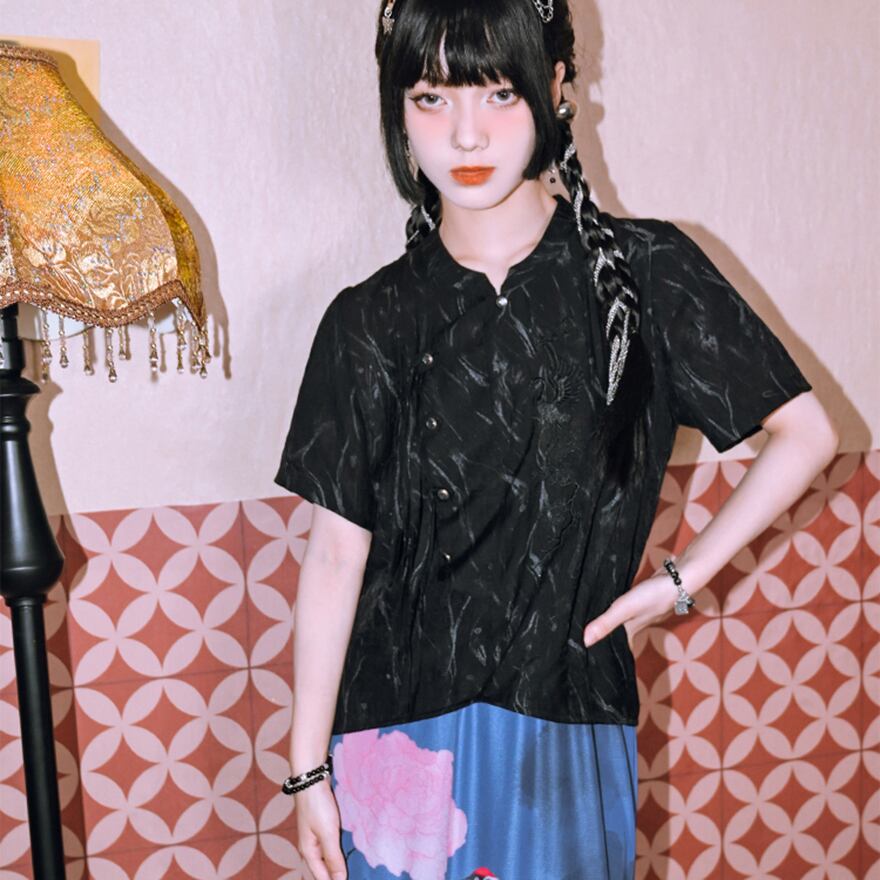漆黒の生地に浮かび上がるように施された、同系色の繊細な刺繍が特徴的な半袖チャイナ風シャツです。