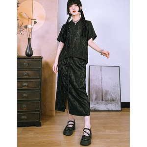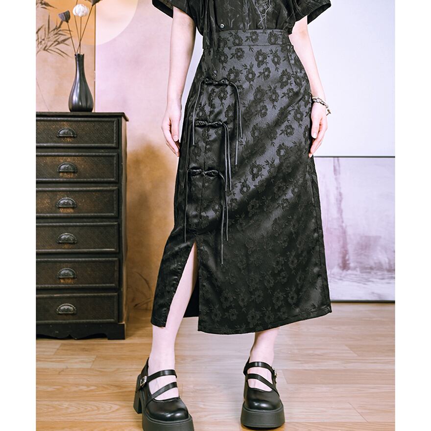 一見シックなブラックスカートでありながら、ジャガードの質感、アシンメトリーなチャイナボタンの配置、そして大胆なスリットといった「古怪舎」ならではの独創的なディテールが随所に光る、存在感抜群の一枚です。
