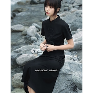 伝統的なチャイナカラーと現代的なデザインが融合した、ブラックのロングチャイナドレスです。