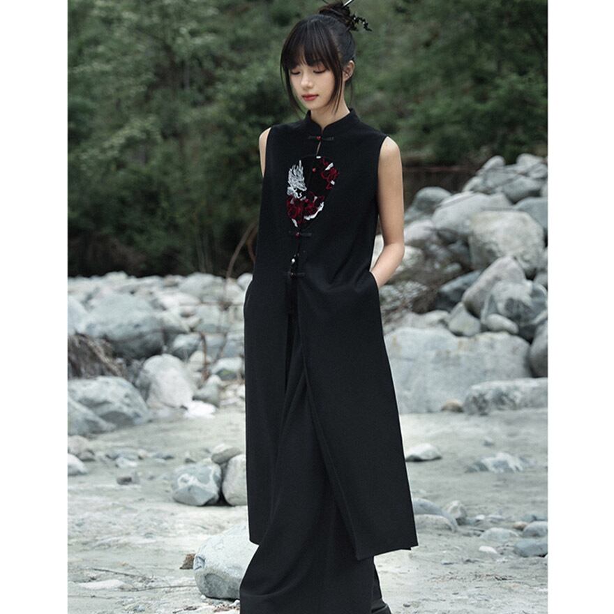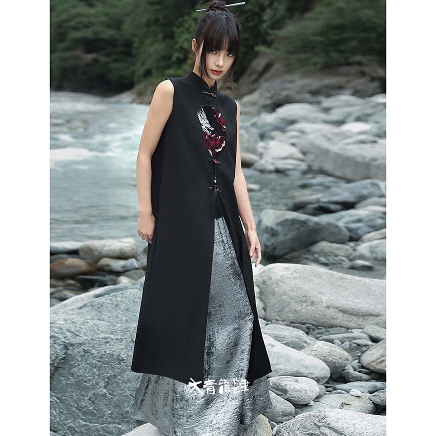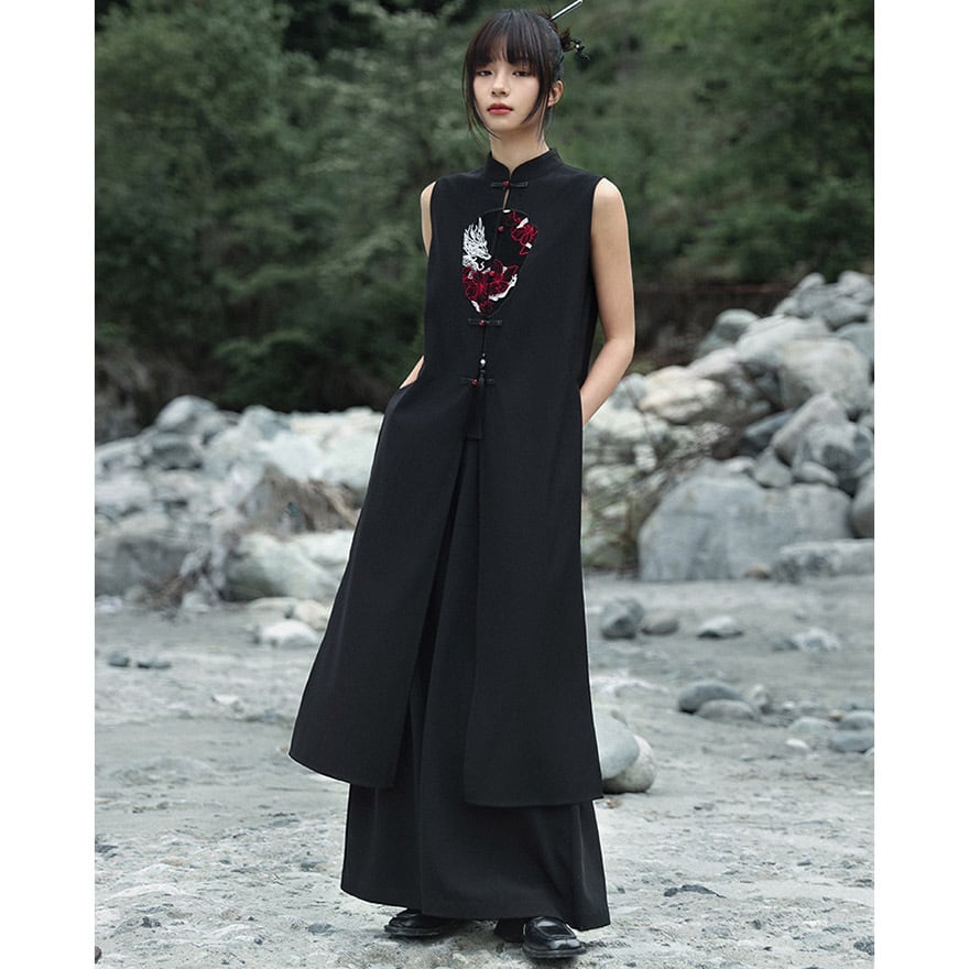重厚感のあるブラックの生地に、鮮烈なドラゴンの顔を刺繍で大胆にあしらった、チャイナ風のロングベストです。ドラゴンの顔周りには一部レザー調の素材を使用し、立体感と異素材のコントラストがクールなアクセントになっています。