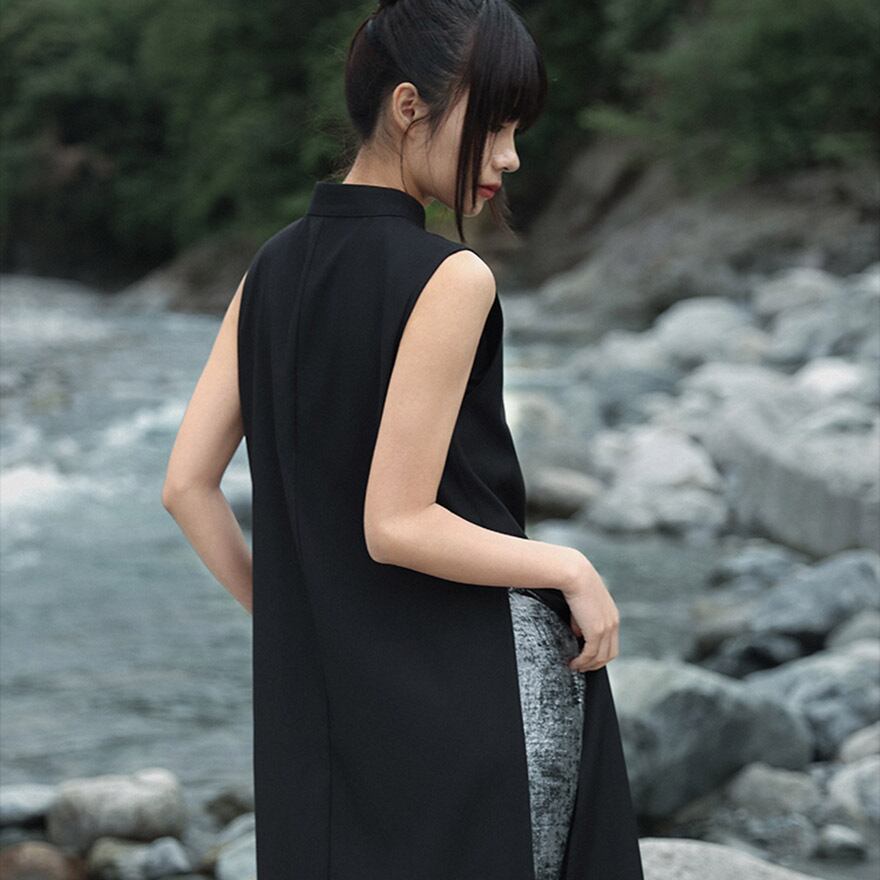 伝統的なチャイナカラーとチャイナボタンがオリエンタルな雰囲気を醸し出しつつ、ノースリーブと深く入ったフロントスリットが現代的でシャープな印象。インナーとのレイヤードが映えるデザインです。
