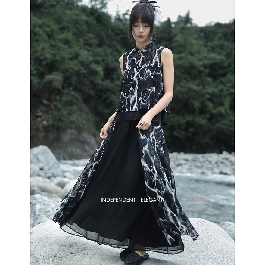 関連キーワード: #チャイナ風 #中華服 #ノースリーブ #シャツ #シフォン #プリント #雷 #稲妻 #水墨画風 #大青龍肆 #ブラック #黒 #夏服 #アシンメトリー #フィッシュテール #サブカル #個性的 #モード #ゴシック #シースルー #レイヤード #20代ファッション #30代ファッション