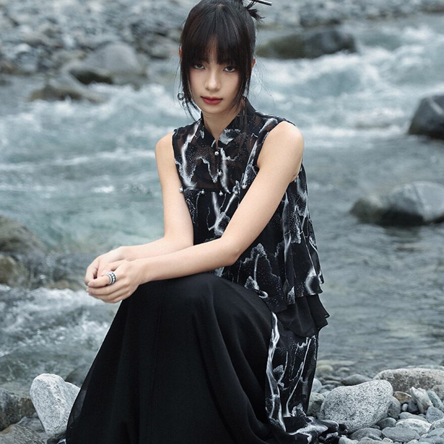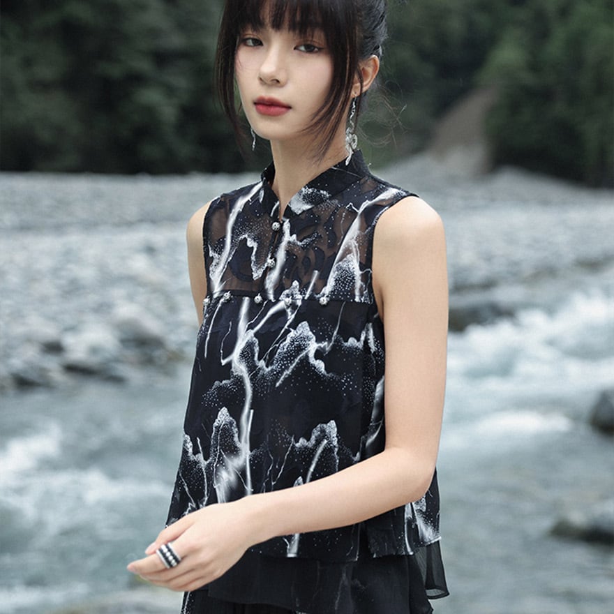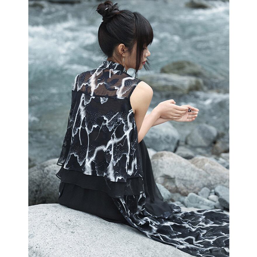 軽やかなブラックのシフォン素材に、雷や稲妻を思わせるような、あるいは水墨画のようなダイナミックなホワイトの抽象プリントが全面に施された、チャイナ風ノースリーブシャツです。