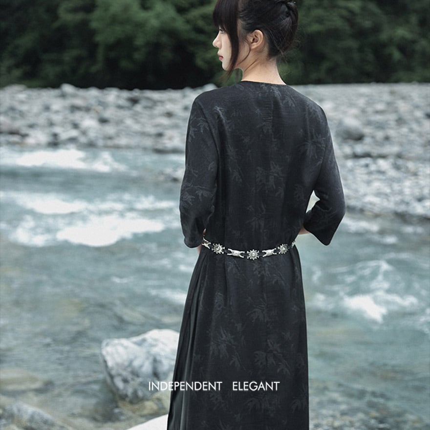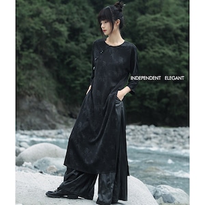 関連キーワード: #チャイナ風 #中華服 #ロングシャツ #シャツワンピース #ブラック #黒 #シルバープリント #植物柄 #大青龍肆 #サブカル #個性的 #モード #夏服 #七分袖 #スリット #レイヤード #20代ファッション #30代ファッション #アジアンテイスト #羽織り