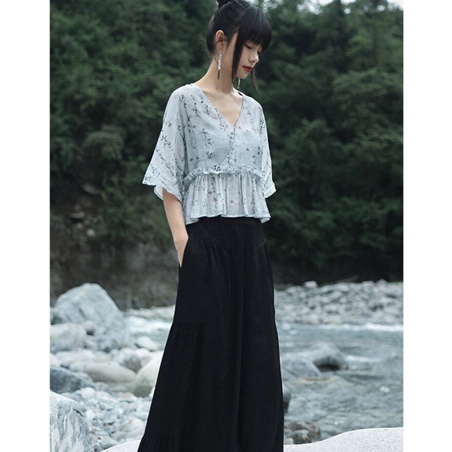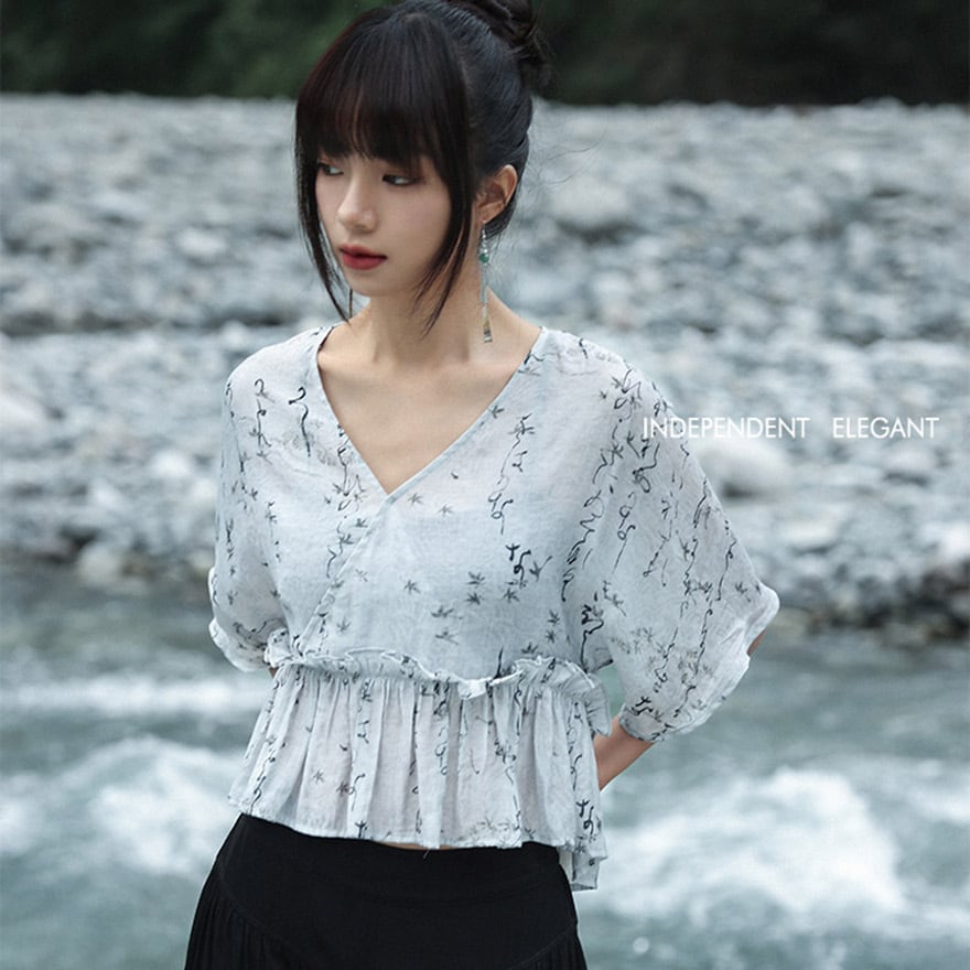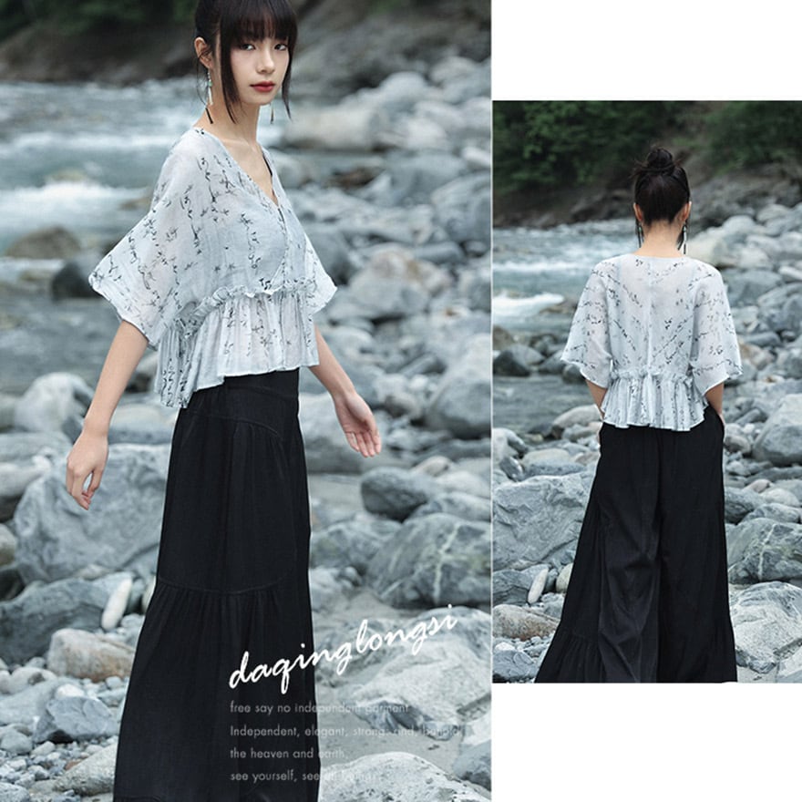 関連キーワード: #チャイナ風 #中華服 #シャツ #ブラウス #Vネック #ペプラム #プリント #水墨画風 #大青龍肆 #夏服 #サブカル #個性的 #シフォン #涼しい #20代ファッション #30代ファッション #トップス #フレアスリーブ
