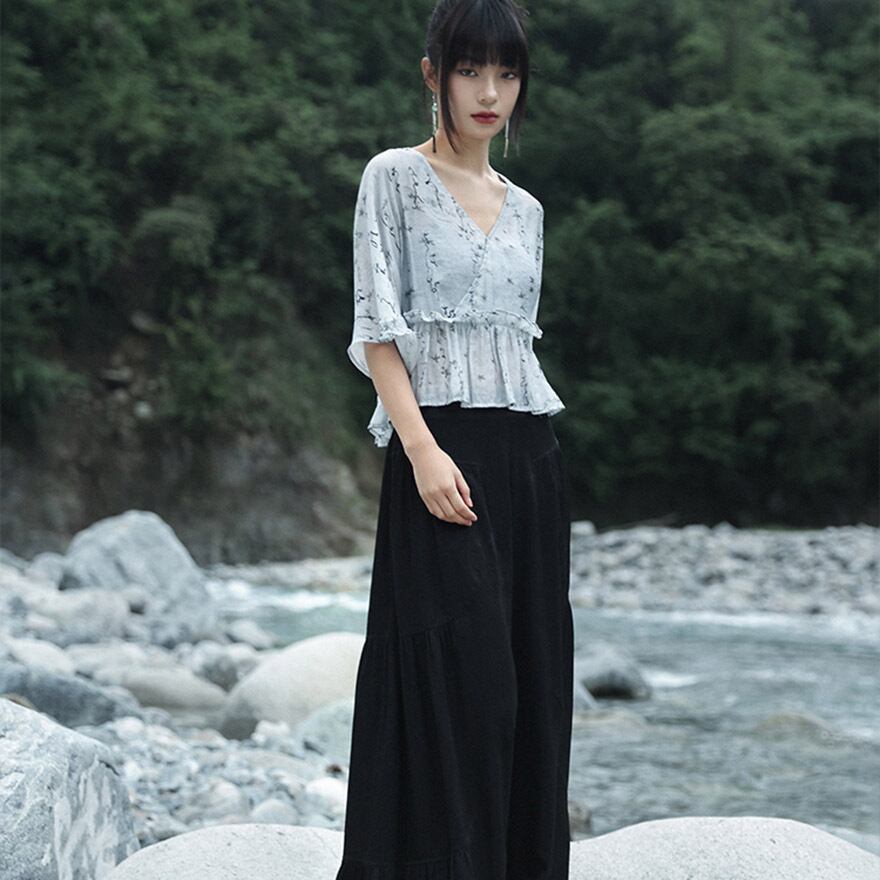 中華ゴシック シャツ Vネック ペプラム プリント柄 大青龍肆 夏服 20代 30代ファッション