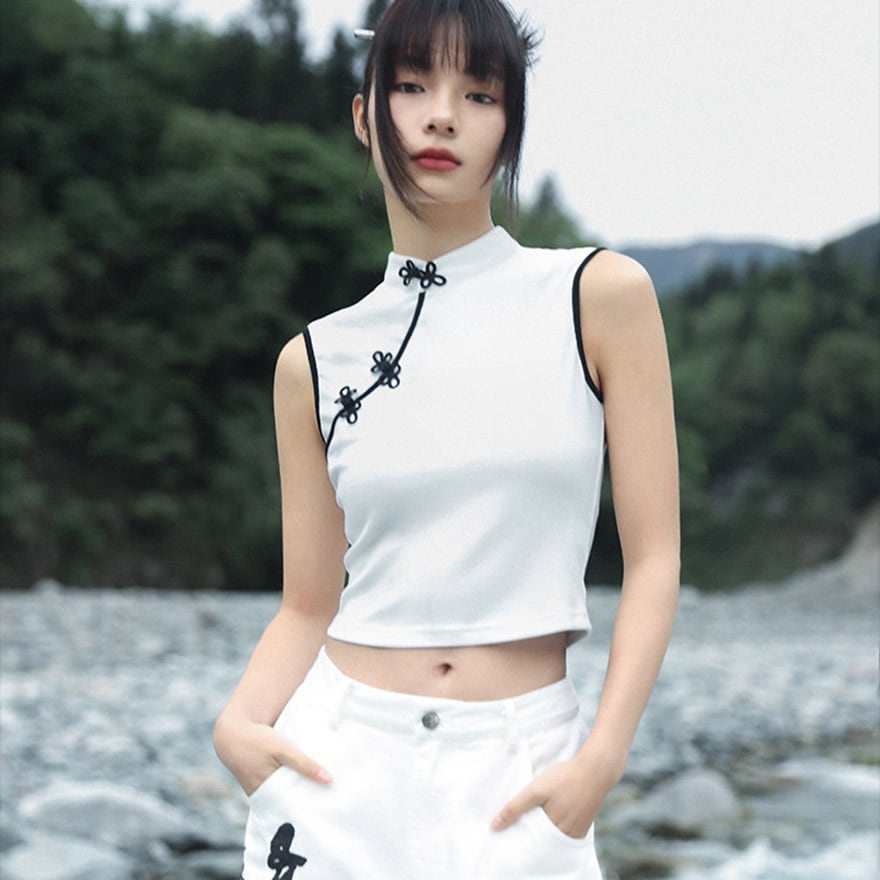 関連キーワード: #チャイナ風 #中華服 #ノースリーブ #トップス #ショート丈 #クロップド丈 #ホワイト #白 #中華ボタン #チャイナボタン #大青龍肆 #サブカル #個性的 #モード #ストリート #夏服 #肌見せ #パイピング #スタンドカラー #20代ファッション #30代ファッション
