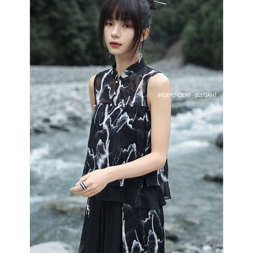 ブラックの軽やかなシフォン生地に、まるで水墨画のような大胆で美しいプリント柄が施されたチャイナ風ロングスカートです。