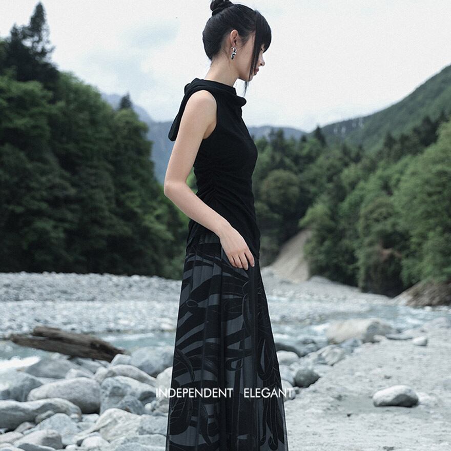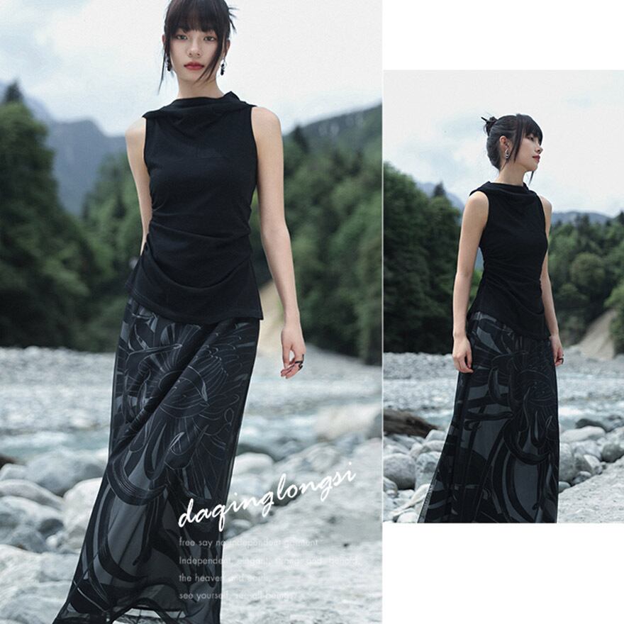 中華ゴシック  ノースリーブ ブラック フード付き 大青龍肆 夏服 20代 30代ファッション