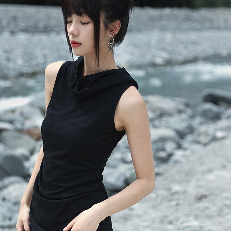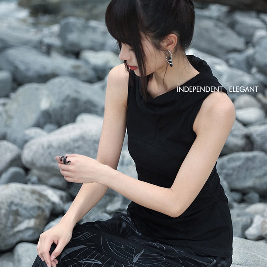 しなやかなブラックの生地を使用した、洗練されたチャイナ風ノースリーブトップスです。最大の特徴は、首元から続くアシンメトリーなドレープフード。