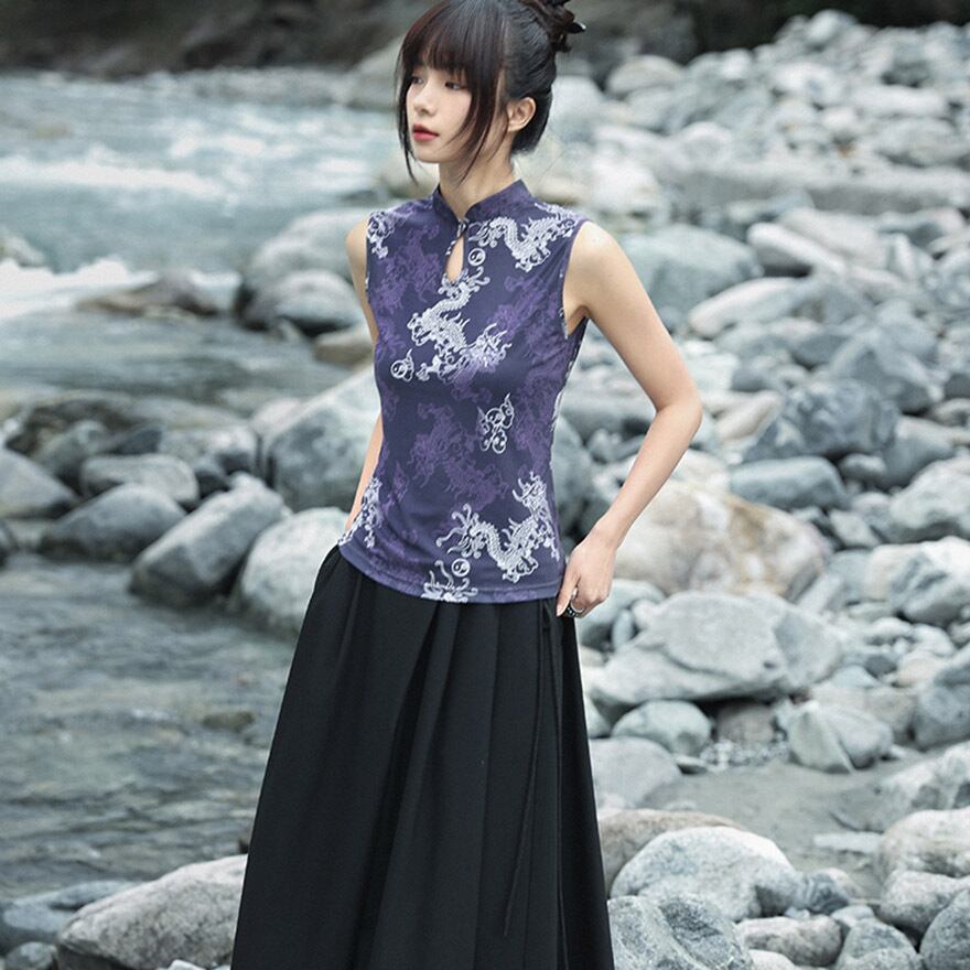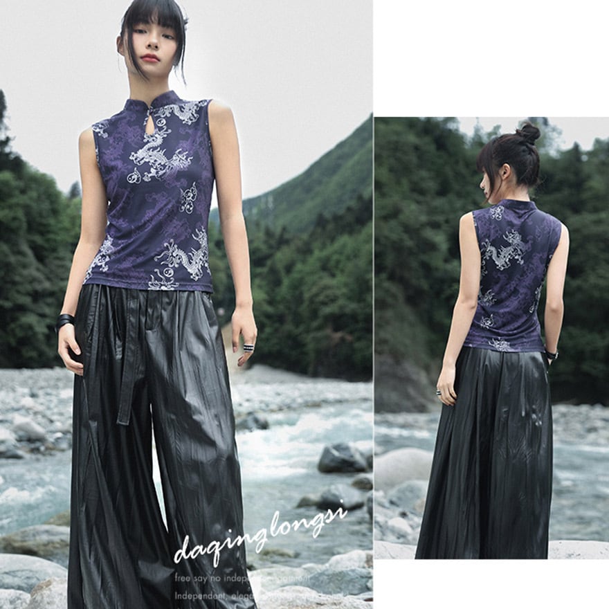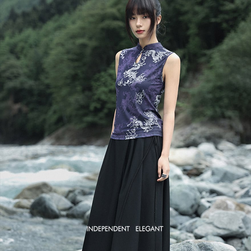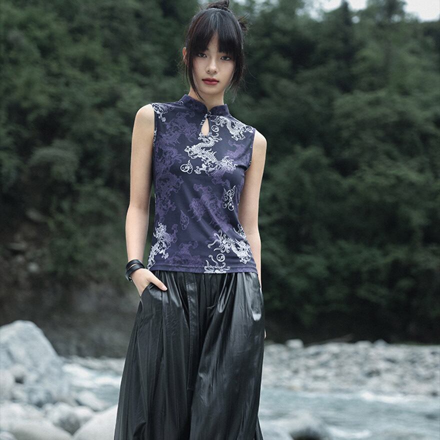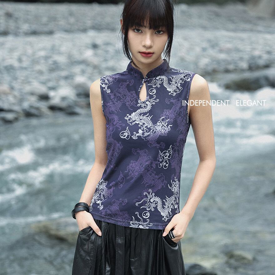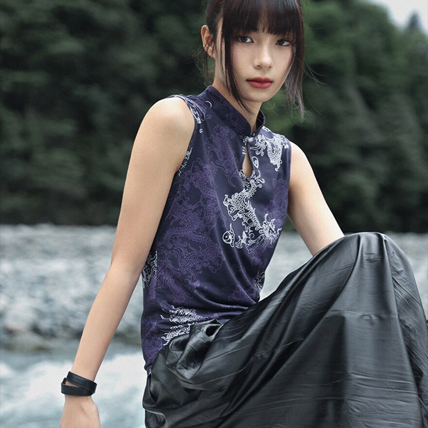 関連キーワード: #チャイナ風 #中華服 #ノースリーブ #トップス #ドラゴン #龍柄 #プリント #パープル #紫紺 #オリエンタル #モード系 #サブカル #個性的 #大青龍肆 #夏服 #20代ファッション #30代ファッション #チャイナカラー #スタンドカラー #フィットシルエット #エレガント #クール