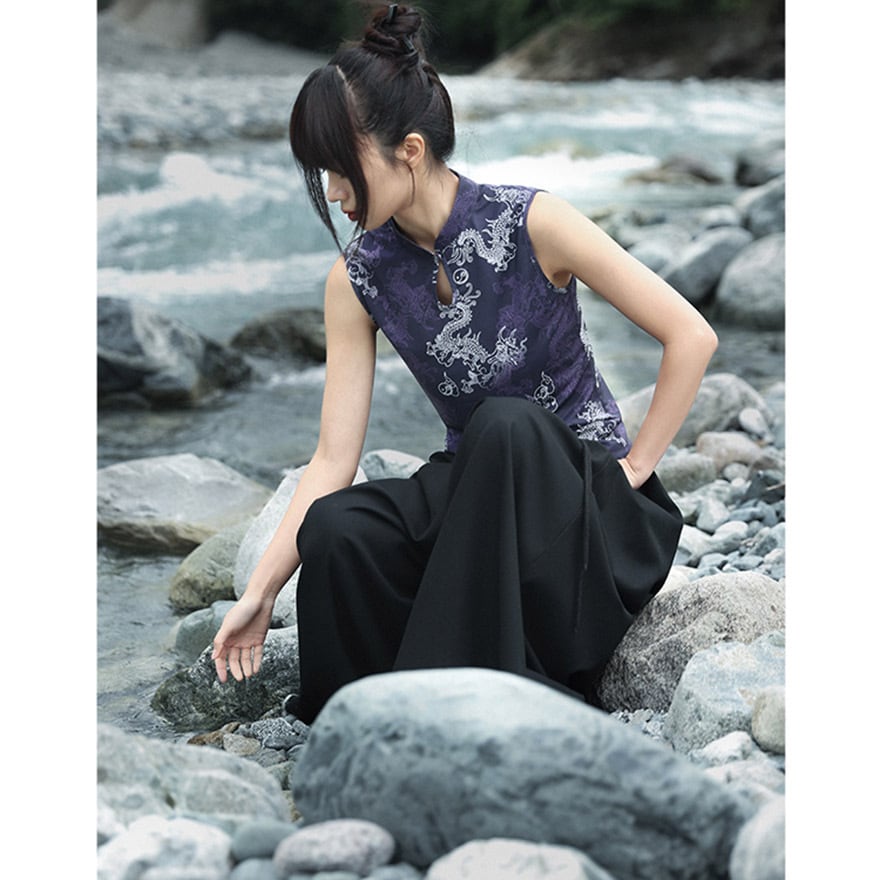 深みのある紫紺色の生地に、繊細かつ力強い白のラインで描かれた龍の総柄プリントが目を惹く、チャイナ風ノースリーブトップスです。