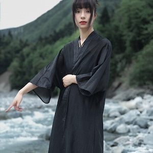 ゆったりとした袖とロング丈が優雅なドレープを生み出し、フロントはチャイナボタンを思わせる紐で留めるデザイン。