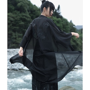 軽やかでほんのり透け感のある漆黒の生地に、背中一面に大胆かつ繊細な蝶の刺繍が施された、ミステリアスな雰囲気漂うチャイナ風ロング羽織りです。