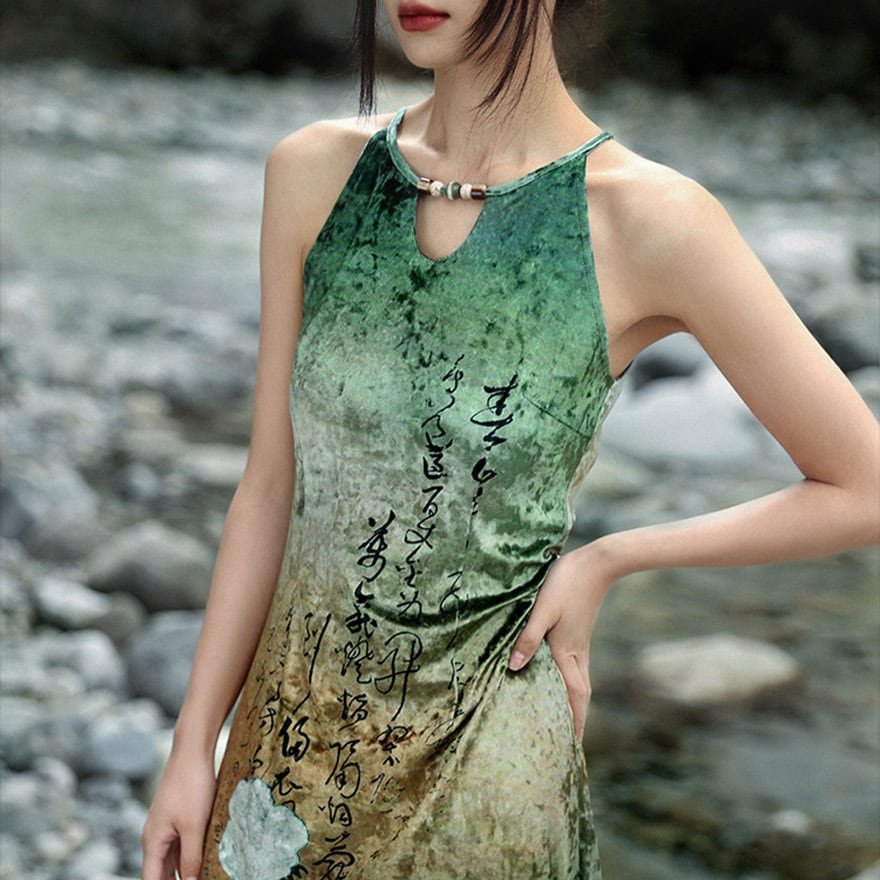 深緑からブラウンへと移ろう複雑なグラデーションのベロア調生地に、白い花々と詩的な漢字がプリントされた、芸術品のようなチャイナ風ロングドレスです。