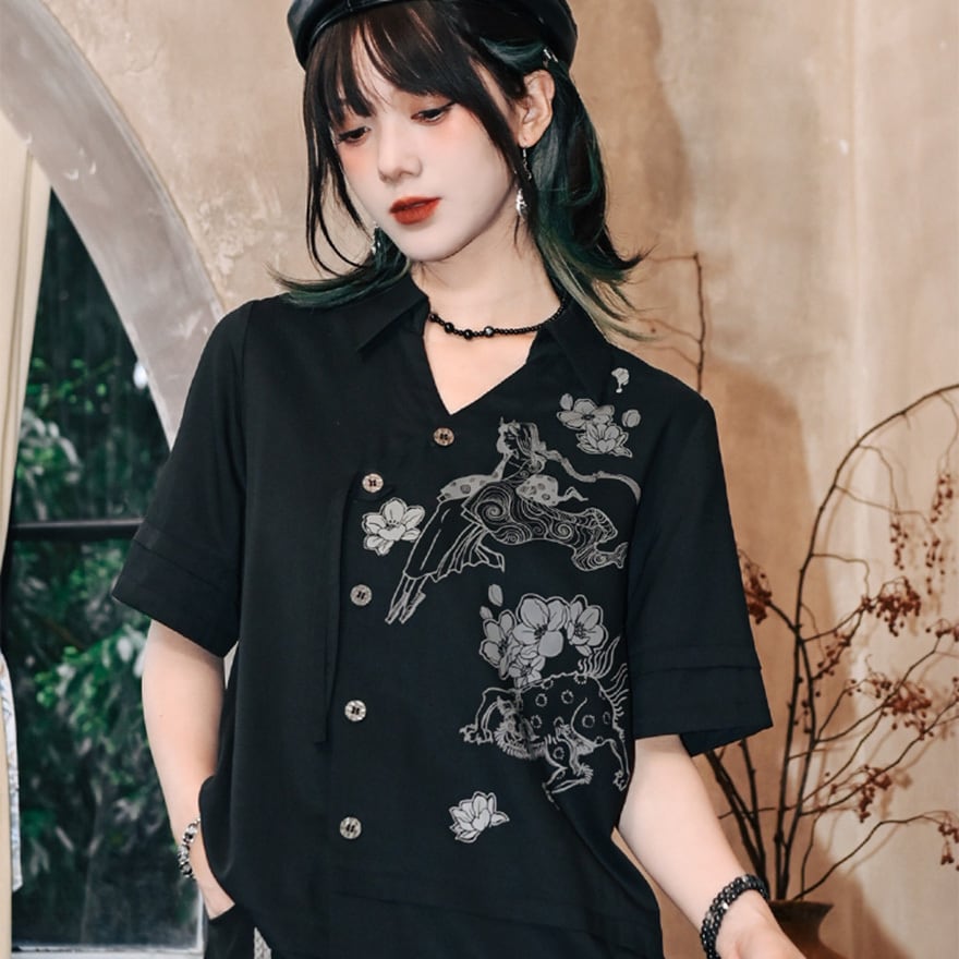 関連キーワード: #チャイナ風 #中華服 #古怪舎 #サブカルファッション #プリントシャツ #Vネック #モノトーン #個性的 #30代ファッション #夏服 #アジアンゴシック #モード系 #アートプリント #ブラックコーデ #幻想的 #半袖