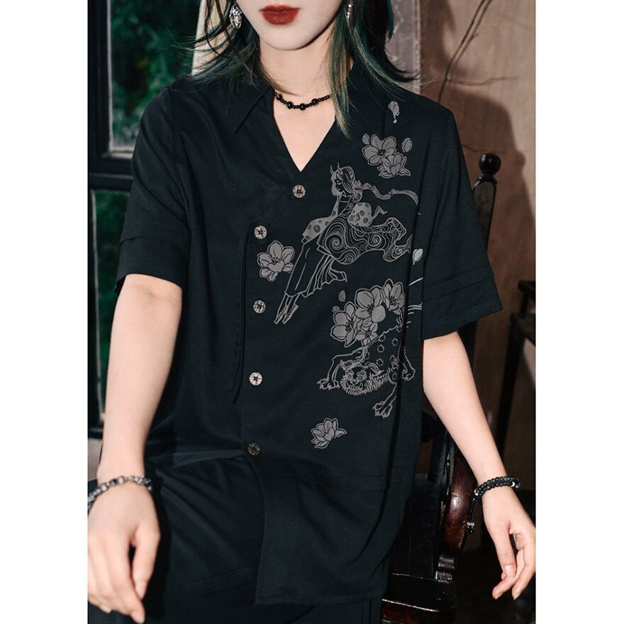 中華ゴシック チャイナ服 中華服 古怪舎 シャツ 半袖 プリント柄 Vネック 中華系ファッション 30代ファッション 夏服
