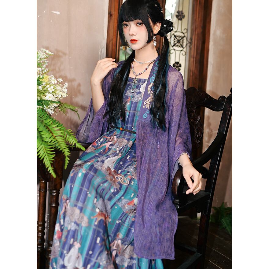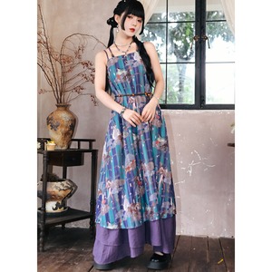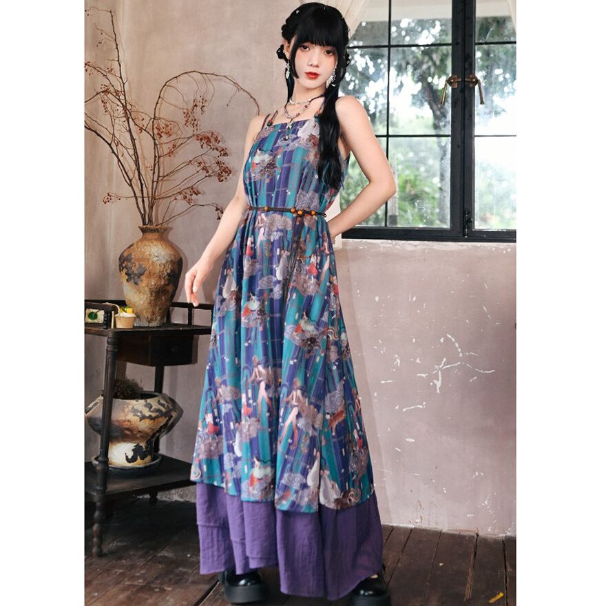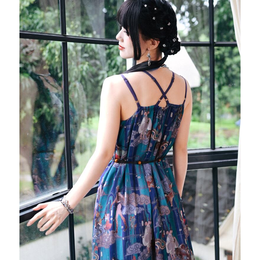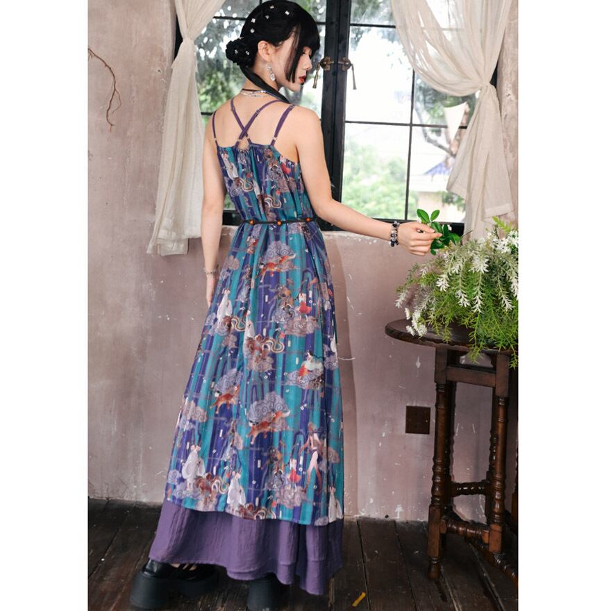 青緑と紫を基調とした、中国の古典絵画や神話の世界を彷彿とさせる幻想的なマルチプリントが全面に施されたノースリーブワンピースです。