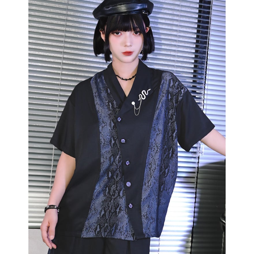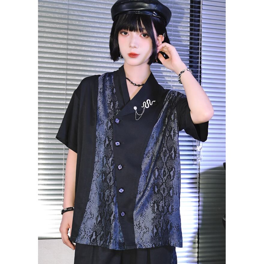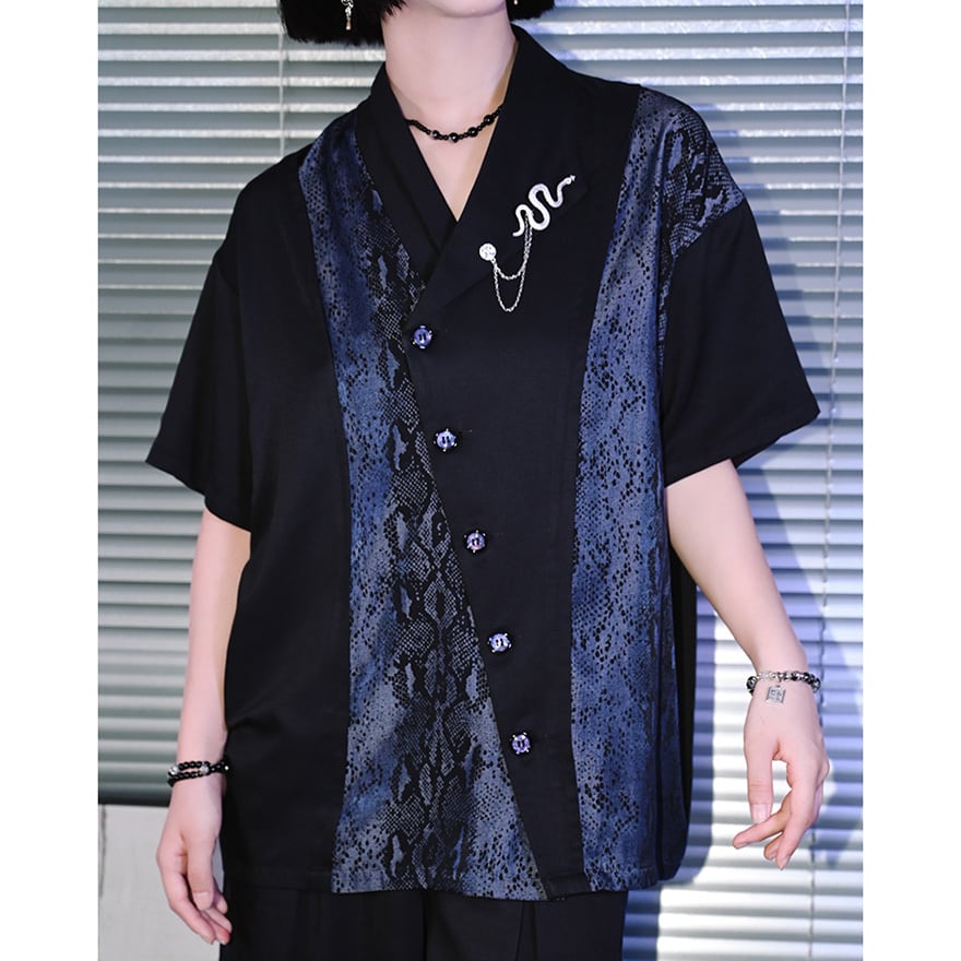 クールなブラックをベースに、前身頃に大胆にあしらわれた青みがかった蛇柄プリントが強烈な個性を放つ半袖シャツです。