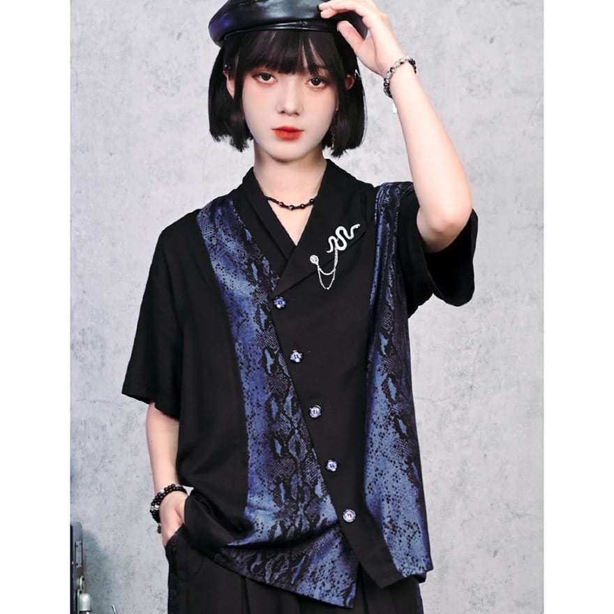 関連キーワード: #チャイナ風 #中華服 #古怪舎 #中華ゴシック #蛇柄 #パイソン柄 #プリントシャツ #半袖シャツ #アシンメトリー #個性的 #30代ファッション #夏服 #ブラックコーデ #モード系 #ゴシック #アニマル柄 #ミステリアス #妖艶 #開襟シャツ