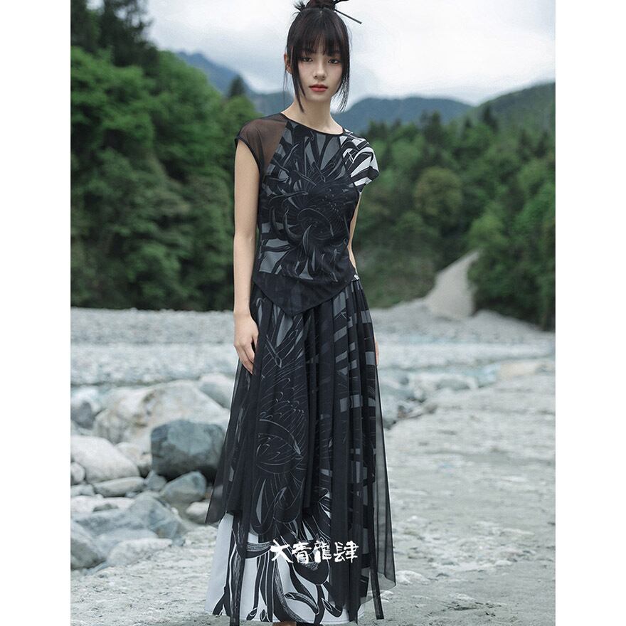中華ゴシック チャイナ服 中華服 レトロ プリントスカート レイヤード シフォン 大青龍肆 夏服 20代 30代ファッション