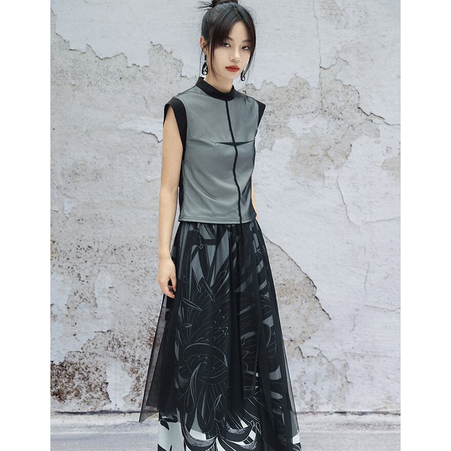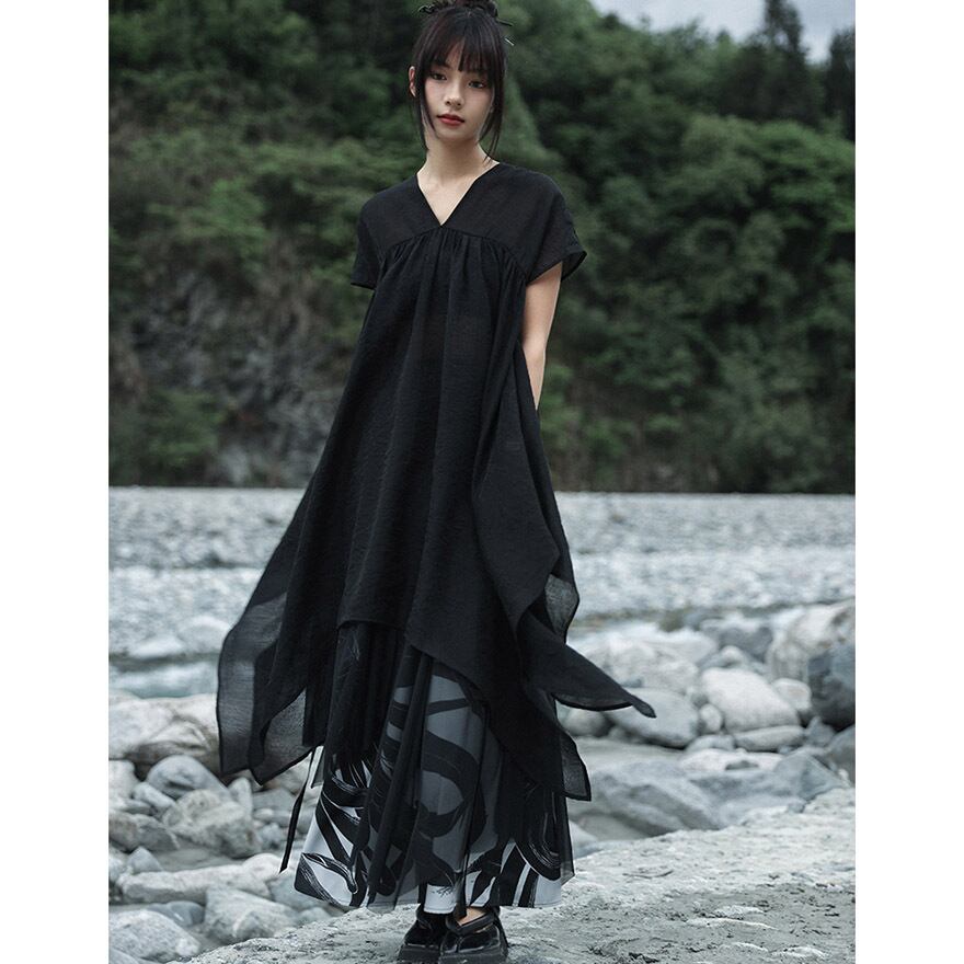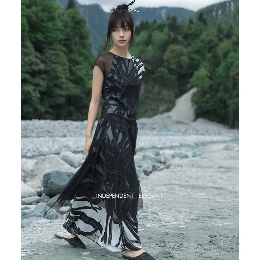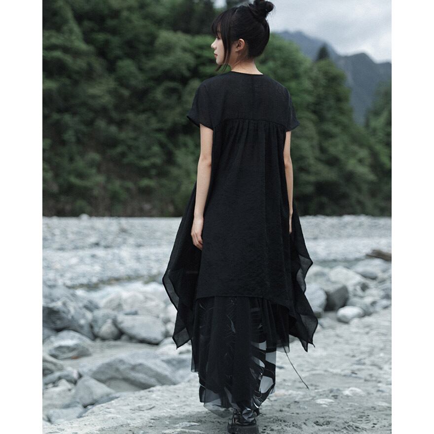 軽やかなシアー素材とアシンメトリーなヘムラインが、動くたびに優雅に揺れ、ミステリアスで涼しげな印象を与えます。