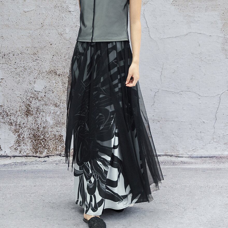 漆黒のシアー素材と、内側に重ねた大胆な菊のプリント生地が美しいコントラストを生み出す、チャイナ風ロングスカートです。