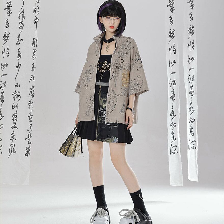 大胆な肌見せと神秘的な霊獣の刺繍が、ミステリアスでエッジの効いた雰囲気を醸し出します。