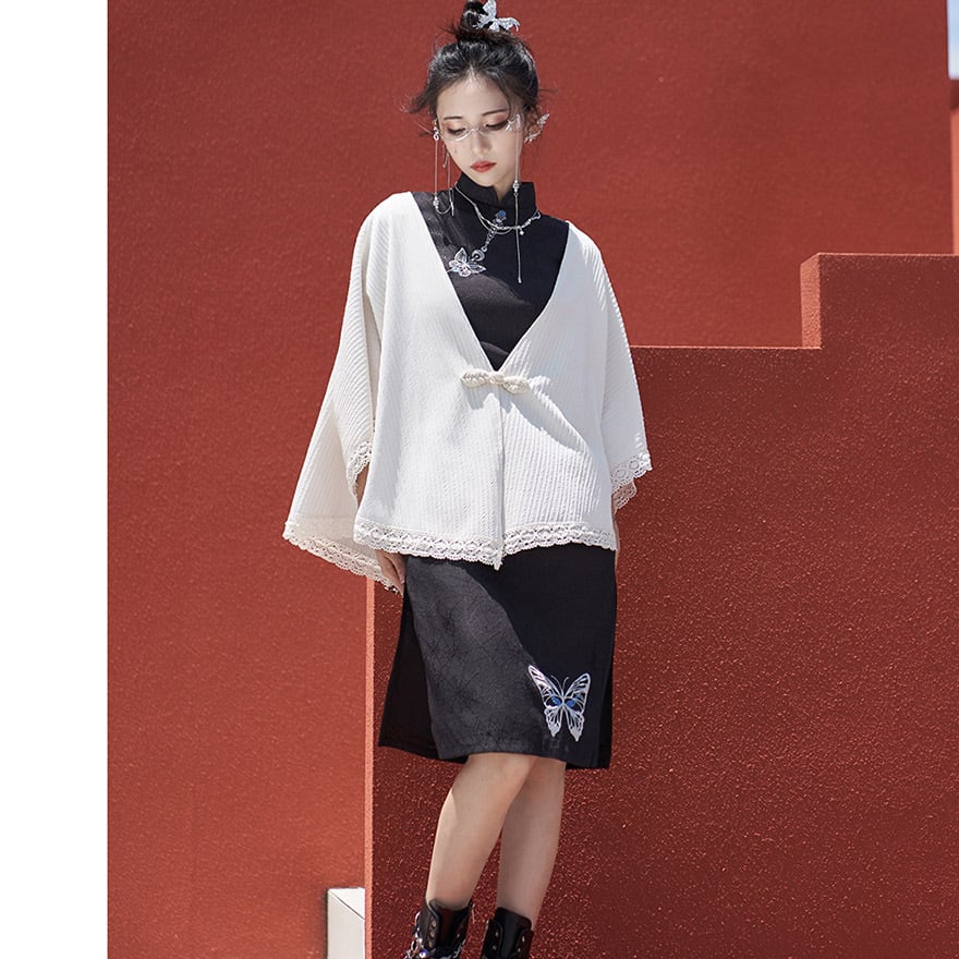 力強く神秘的な龍と、儚くも美しい蝶のコントラストが目を惹き、ダークでオリエンタルな世界観を存分に楽しめるチャイナドレス。