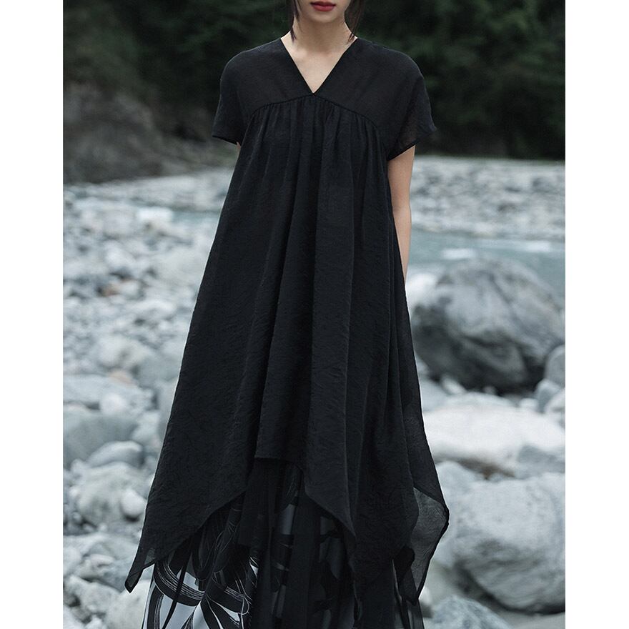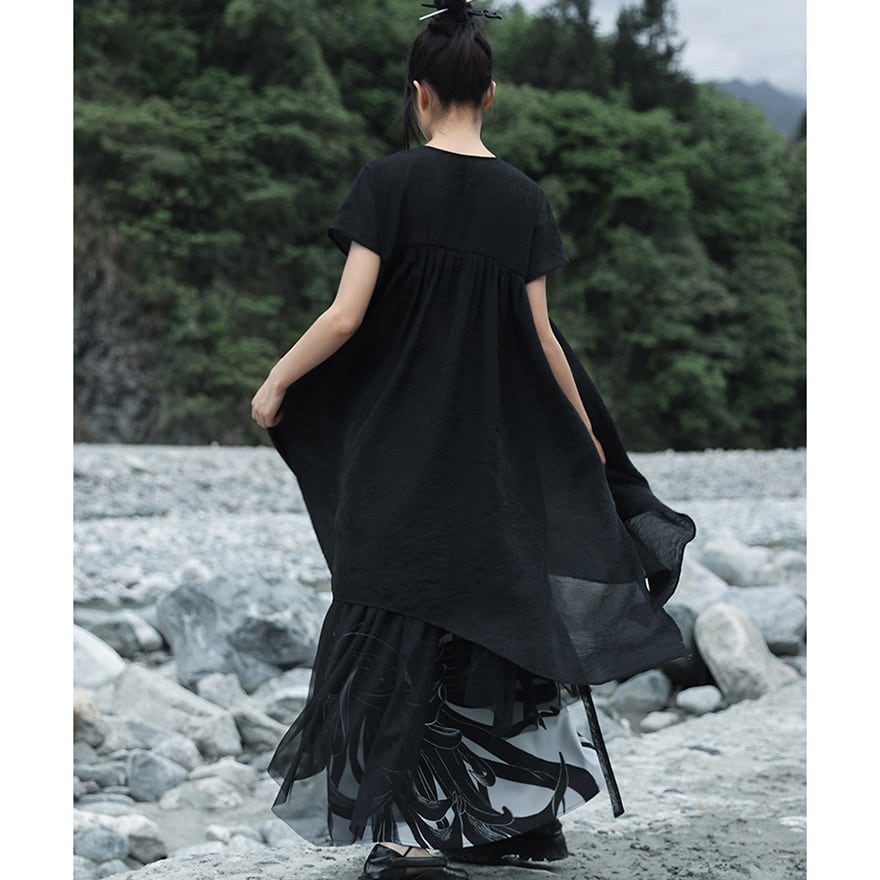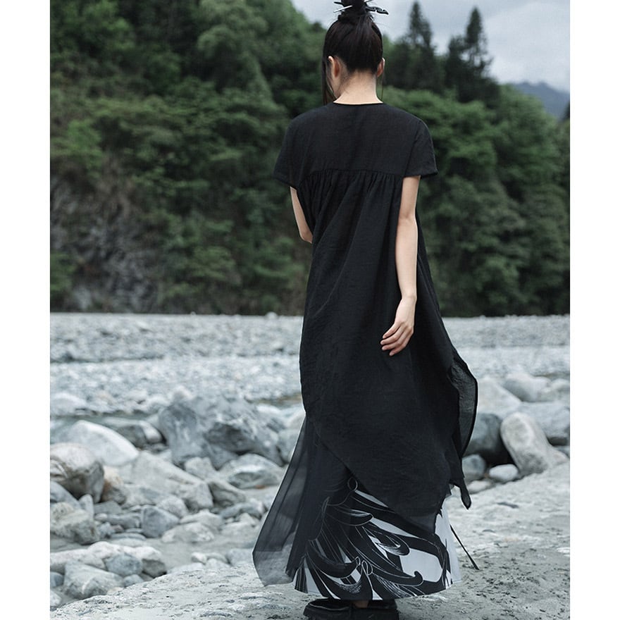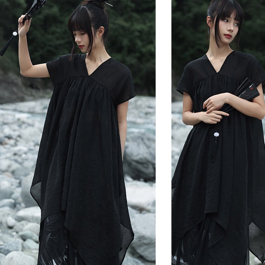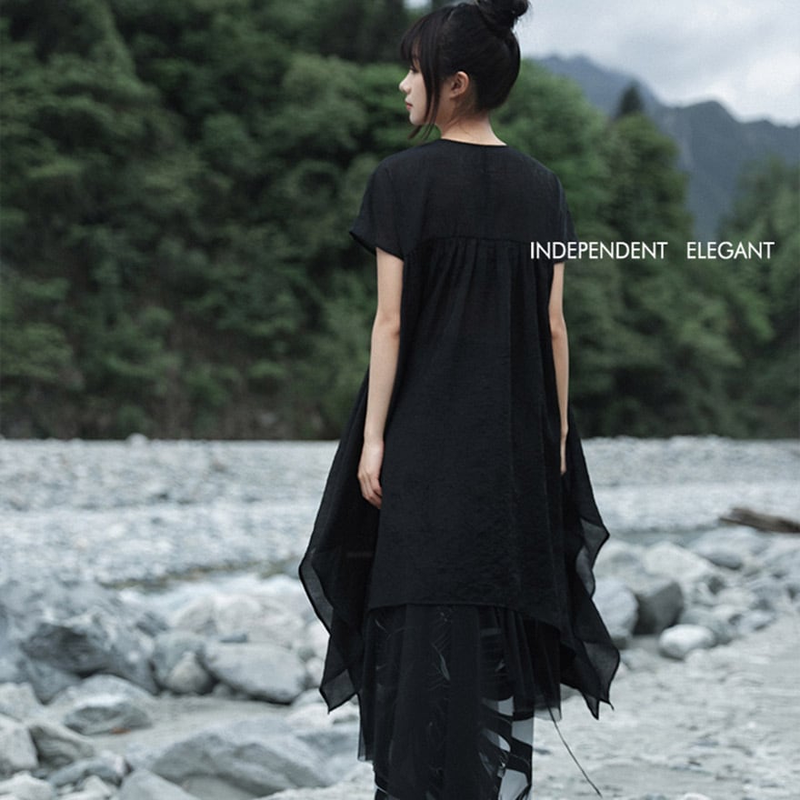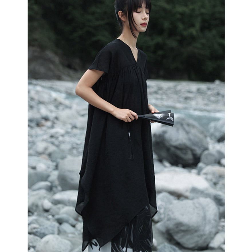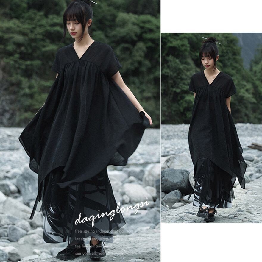 中華ゴシック チャイナドレス ワンピース ブラック ゆったり 黒 レイヤード 大青龍肆 夏服 20代 30代ファッション
