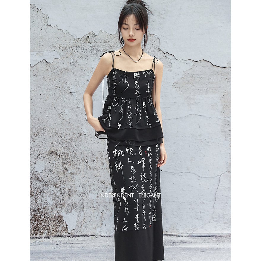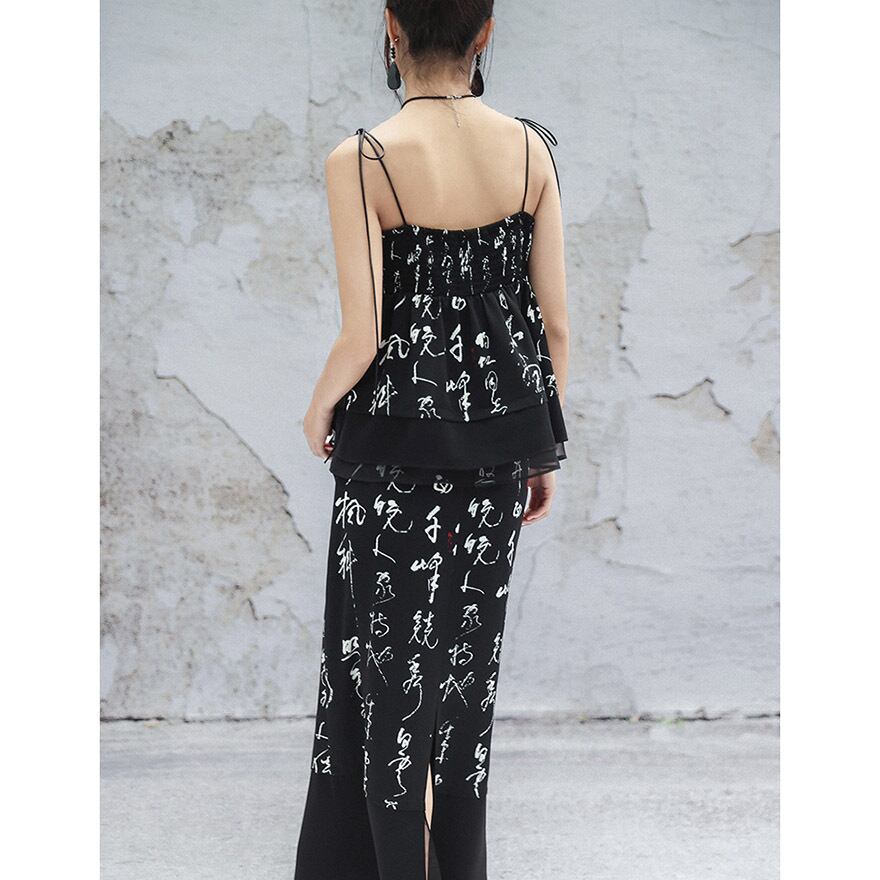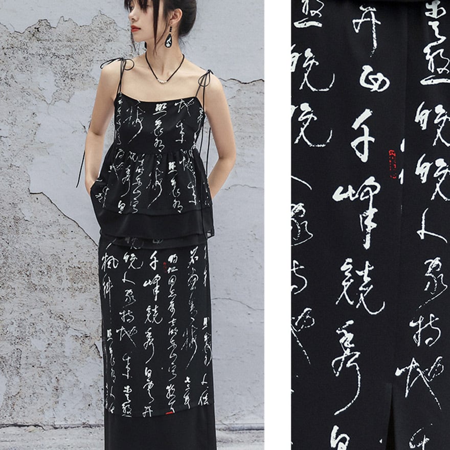 関連キーワード: #チャイナ風 #中華服 #ロングスカート #漢字 #書道 #和柄 #モード系 #サブカル #モノトーン #スリットスカート #夏服 #大青龍肆 #セットアップ