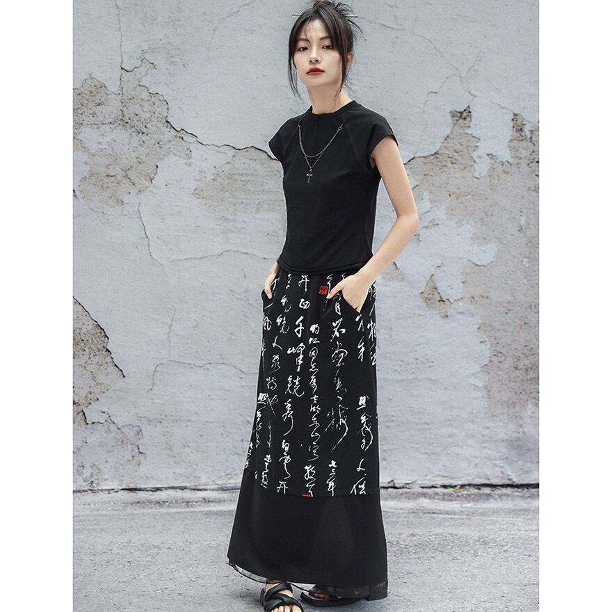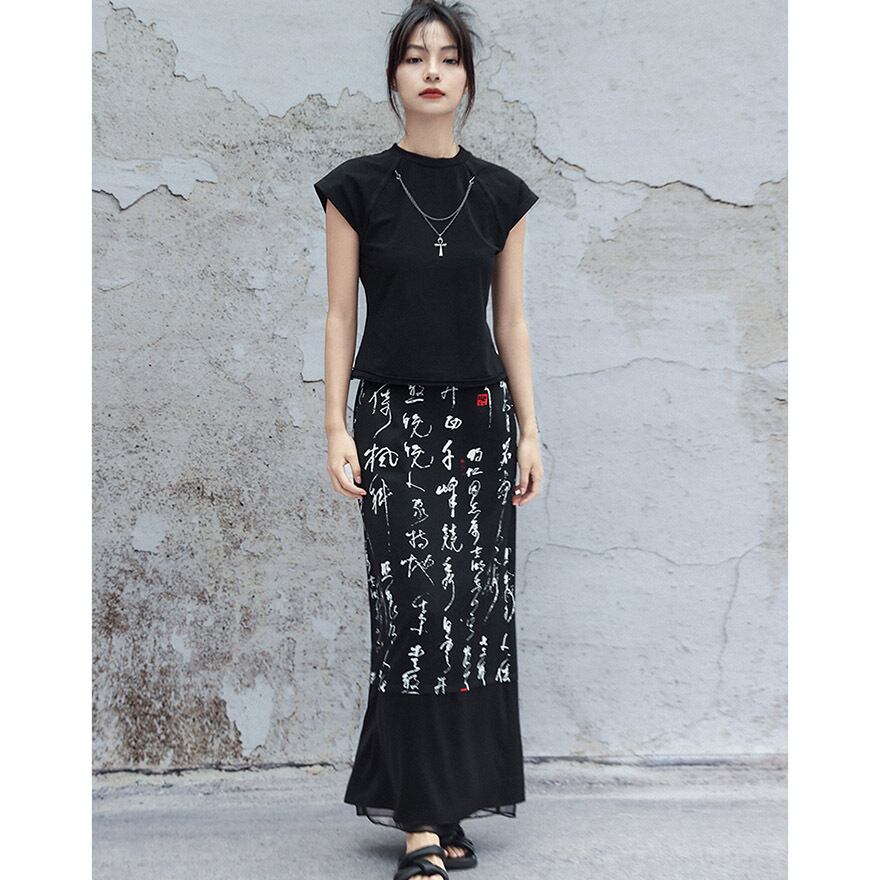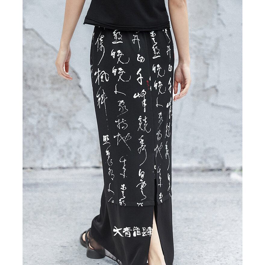 中華ゴシック ロングスカート 漢字 書道プリント柄 刺繍 大青龍肆 夏服 20代 30代ファッション