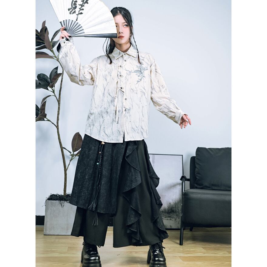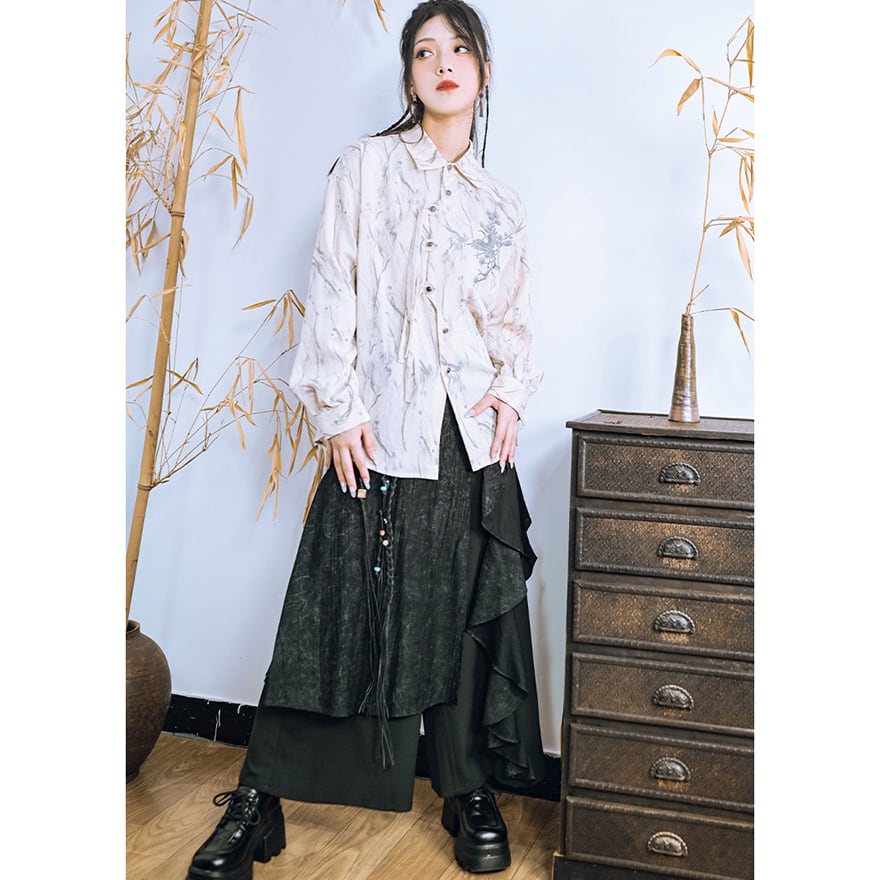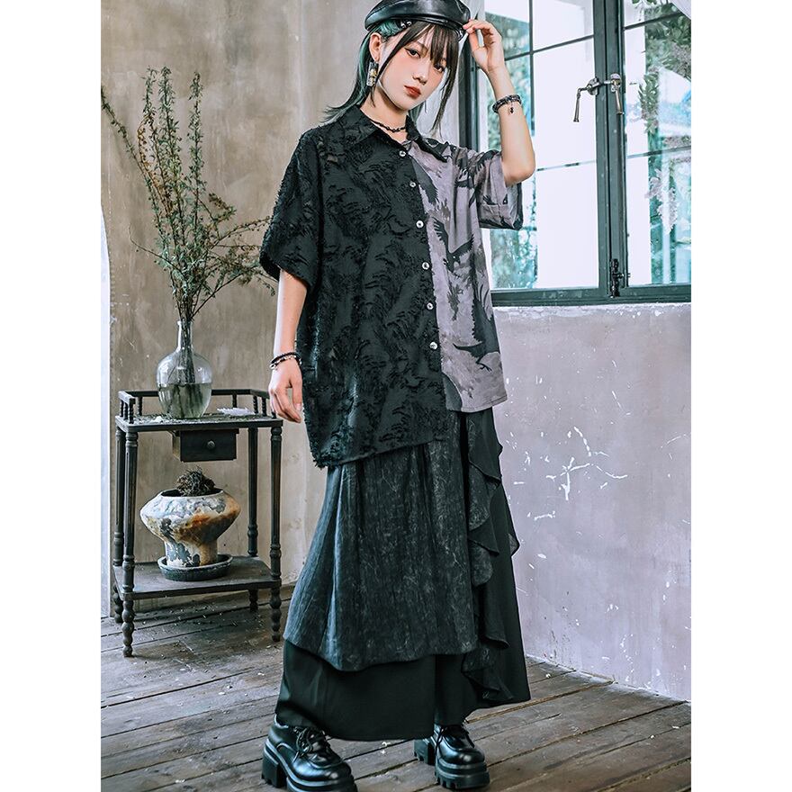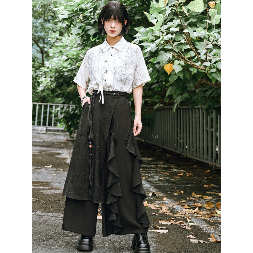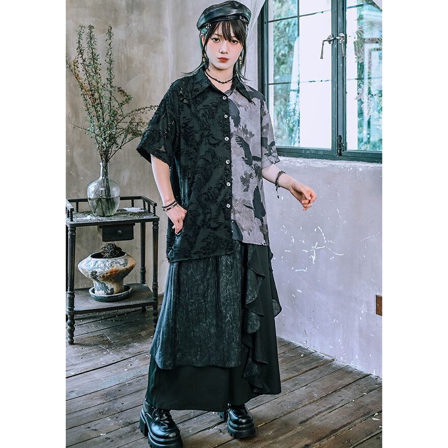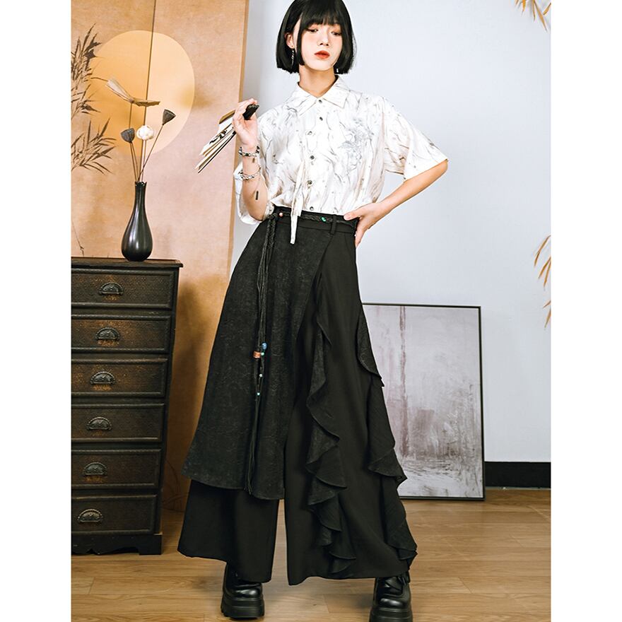 関連キーワード: #チャイナ風 #中華服 #ワイドパンツ #ラップパンツ #レイヤード #アシンメトリー #モード系 #サブカル #フリル #異素材 #ブラックコーデ #夏服 #古怪舎