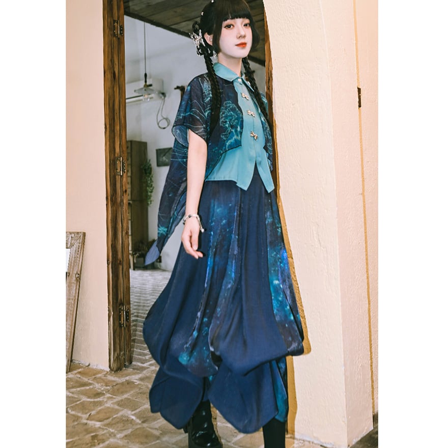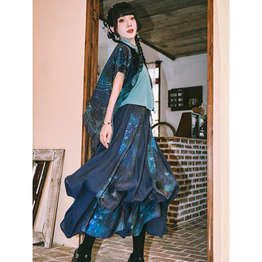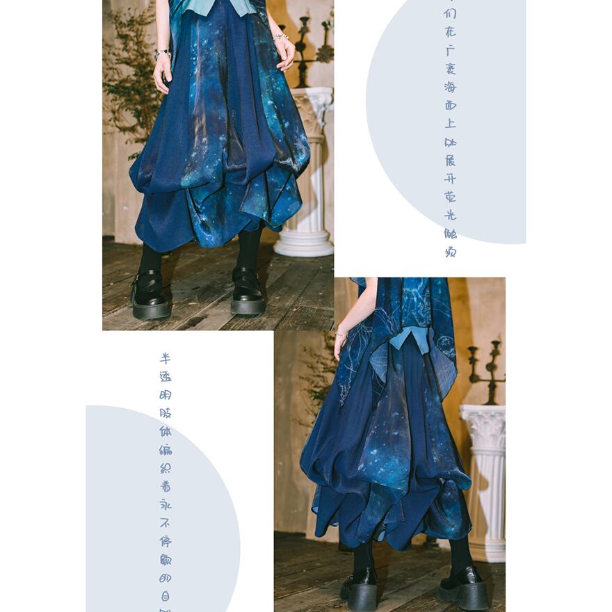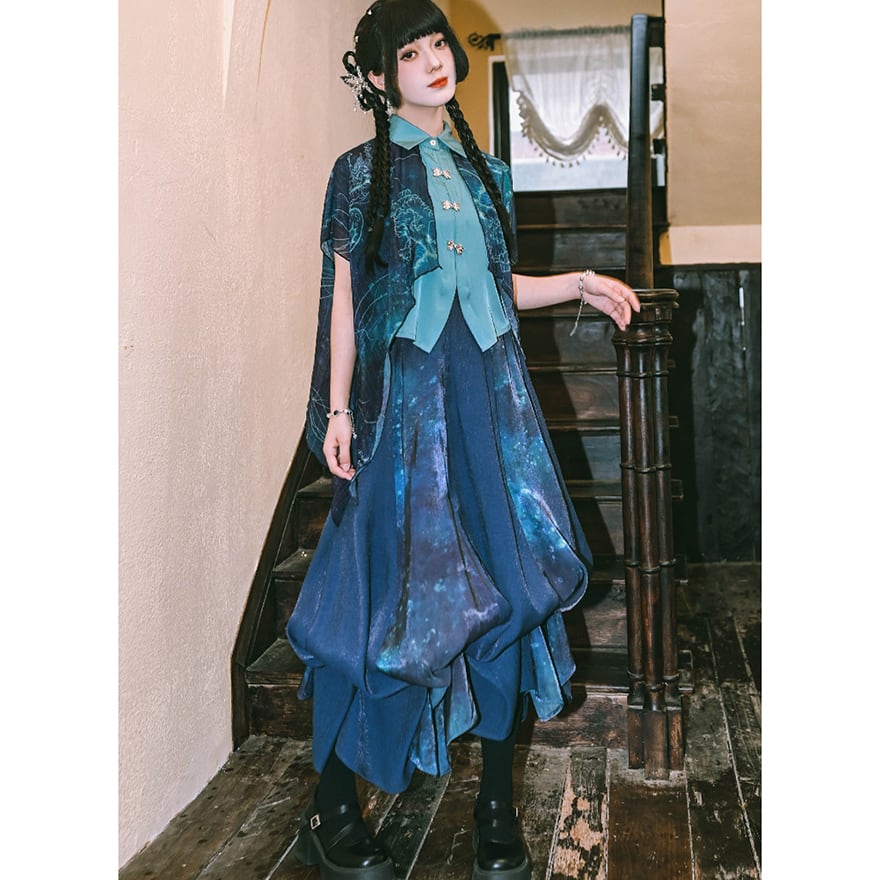 関連キーワード: #チャイナ風 #中華服 #ワイドパンツ #バルーンパンツ #袴パンツ #クラゲ柄 #2WAY #モード系 #サブカル #個性的ファッション #青 #夏服 #古怪舎