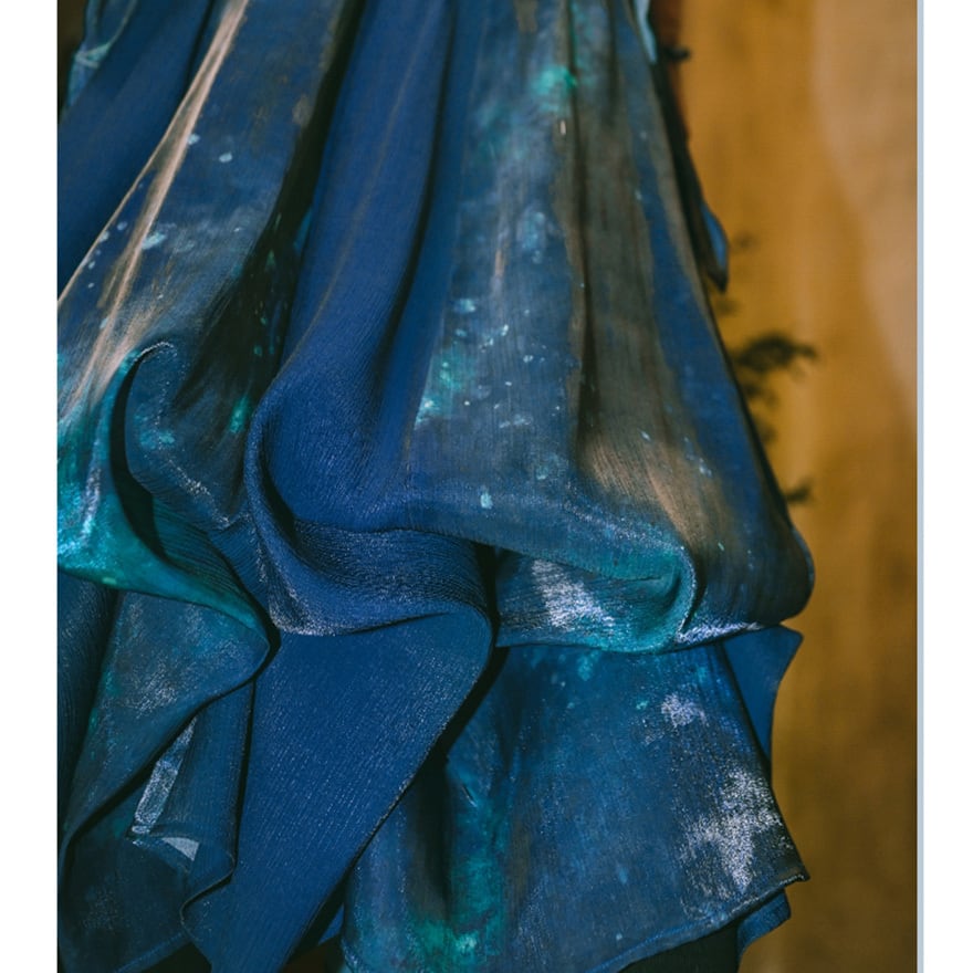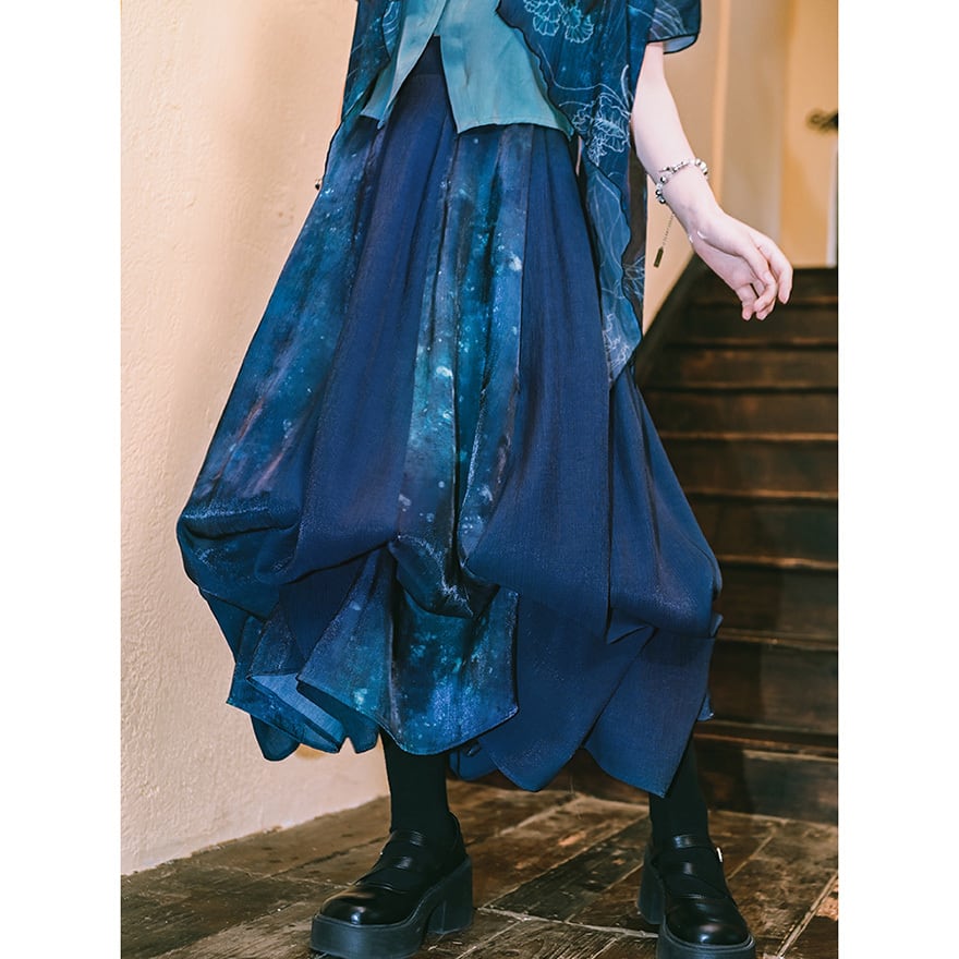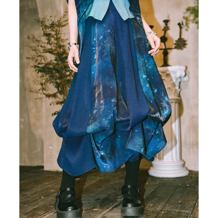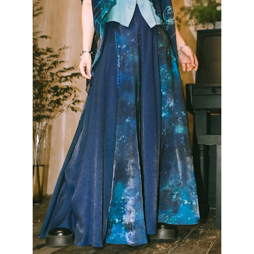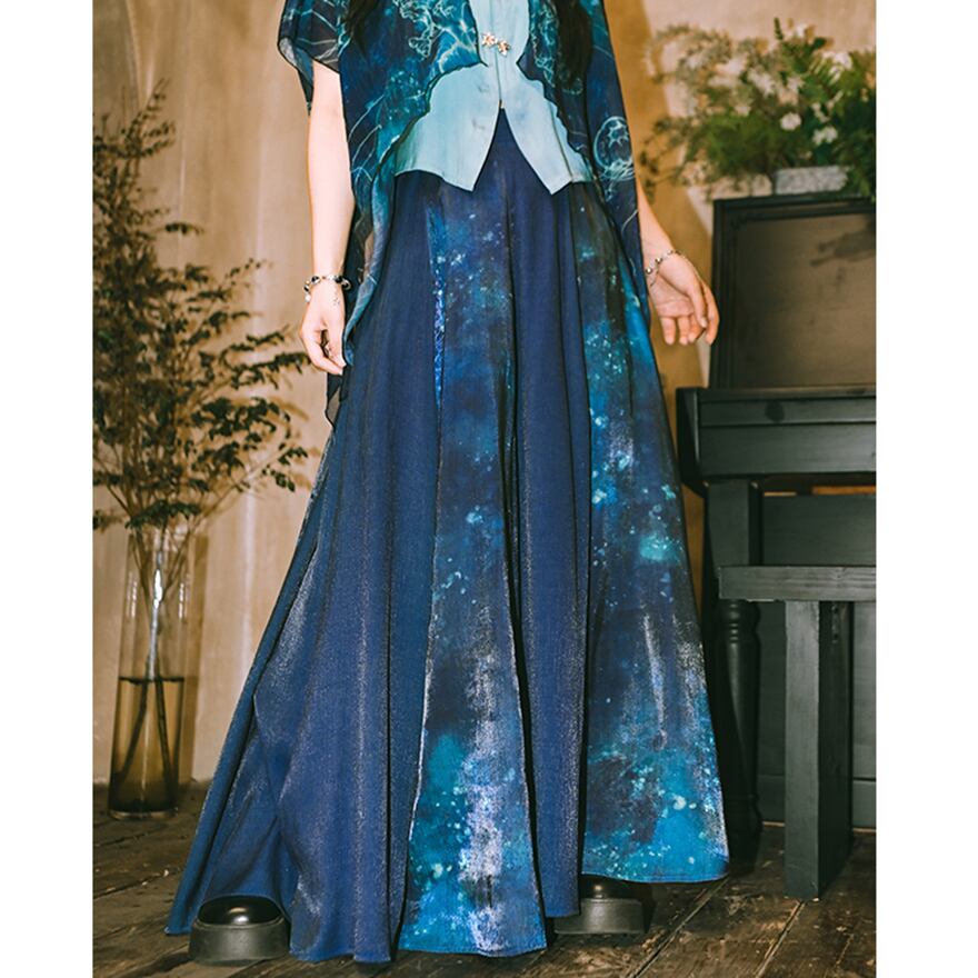 シンプルなトップスと合わせるだけで幻想的な世界観が完成し、同柄の羽織りと合わせれば、よりコンセプチュアルなセットアップスタイルを楽しめます。