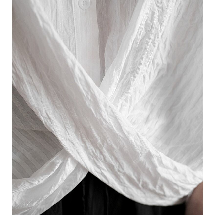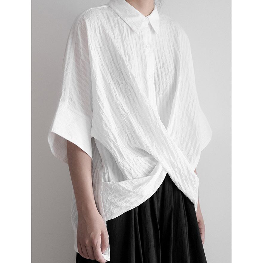 フロントで大胆に生地をねじった、アーティスティックなデザインが目を引くシャツです。