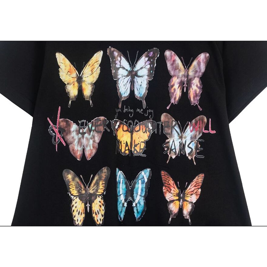フロントには色鮮やかな蝶の標本プリント、バックにはシアー素材に広がる大きな蝶の羽の刺繍が施された、二つの顔を持つ黒いTシャツです。