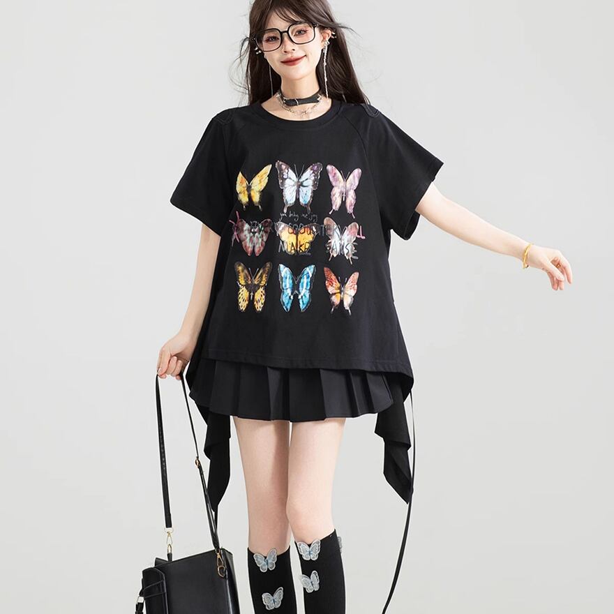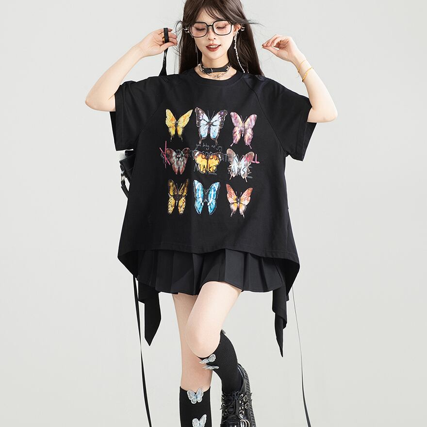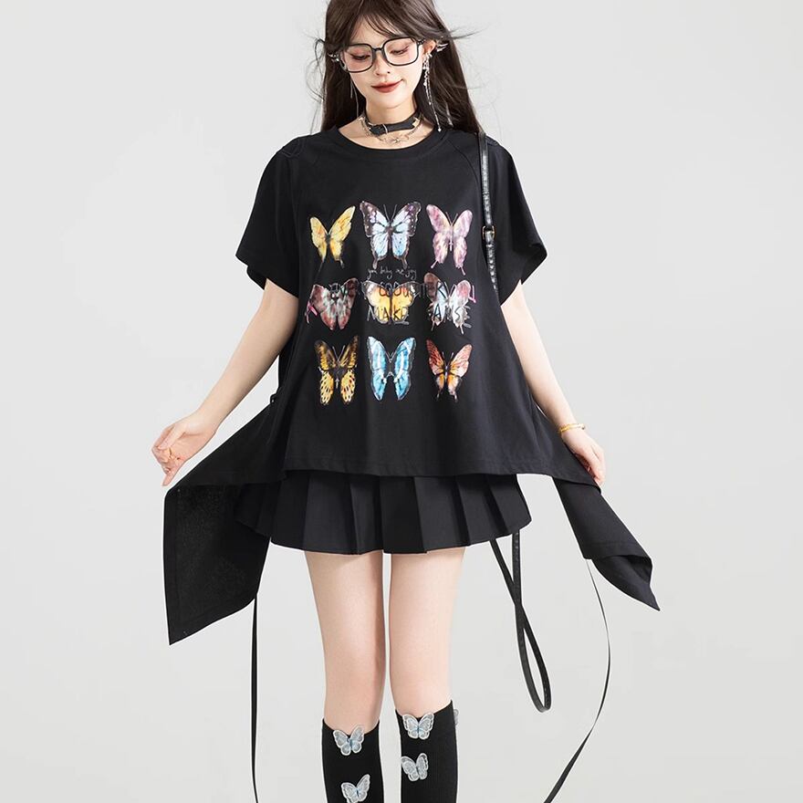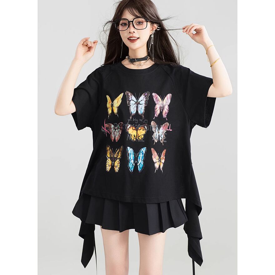 ゴスロリ 地雷服 Tシャツ アシンメトリー バタフライ 刺繍 バックオープン 夏服 KEIKOシリーズ