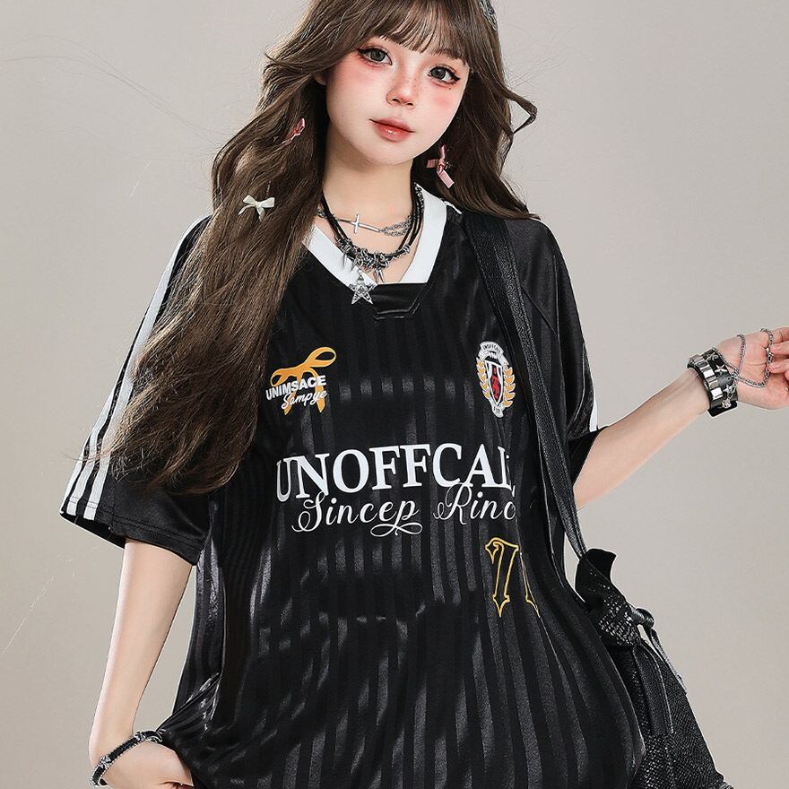 ゴスロリ通販 With U ゴスロリ系 地雷 アメカジ Tシャツ Vネック スポーティ カジュアル ゆったりめ