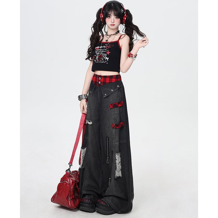 ウエストの鮮やかな赤チェック柄切り替えが、ダークな雰囲気の中に際立つアクセント。大胆なクラッシュダメージ加工に加え、星形のスタッズやジッパーチャーム、サイドのDカンなど、パンキッシュなディテールが随所に散りばめられています。